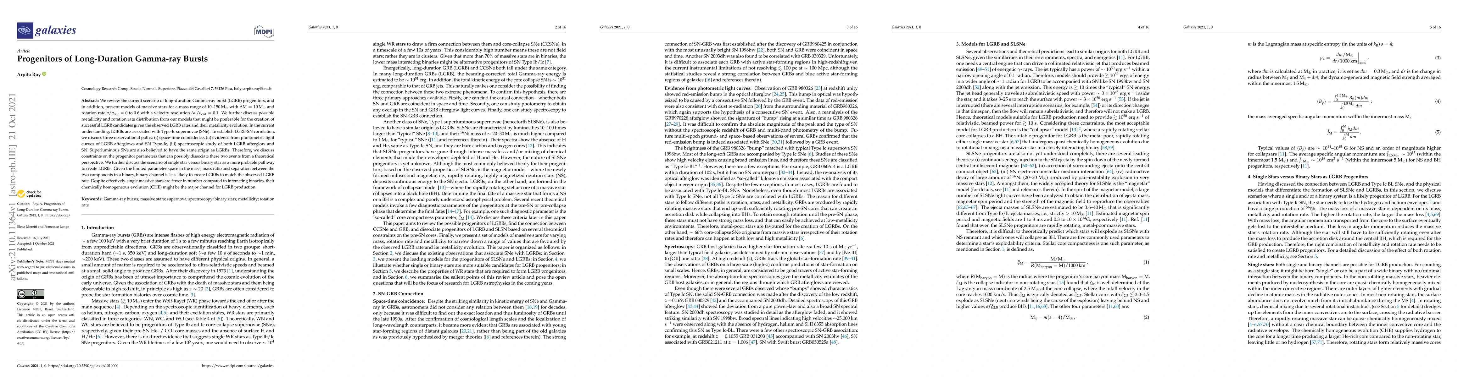 Researchers review possible progenitors of long-duration Gamma-ray Bursts, proposing massive stars as a primary channel for their creation, and discuss the role of metallicity and rotation rate in LGRB production.