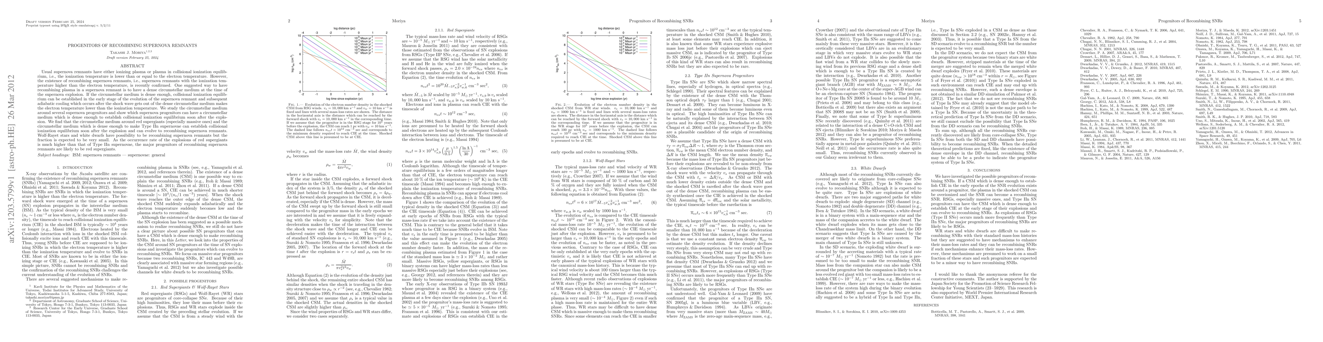 This paper investigates the progenitors of recombining supernova remnants, confirming that dense circumstellar medium around red supergiants, especially massive ones, and Type IIn supernovae can lead to such remnants. The study concludes that red supergiants are the major progenitors due to their higher explosion rates compared to Type IIn supernovae.