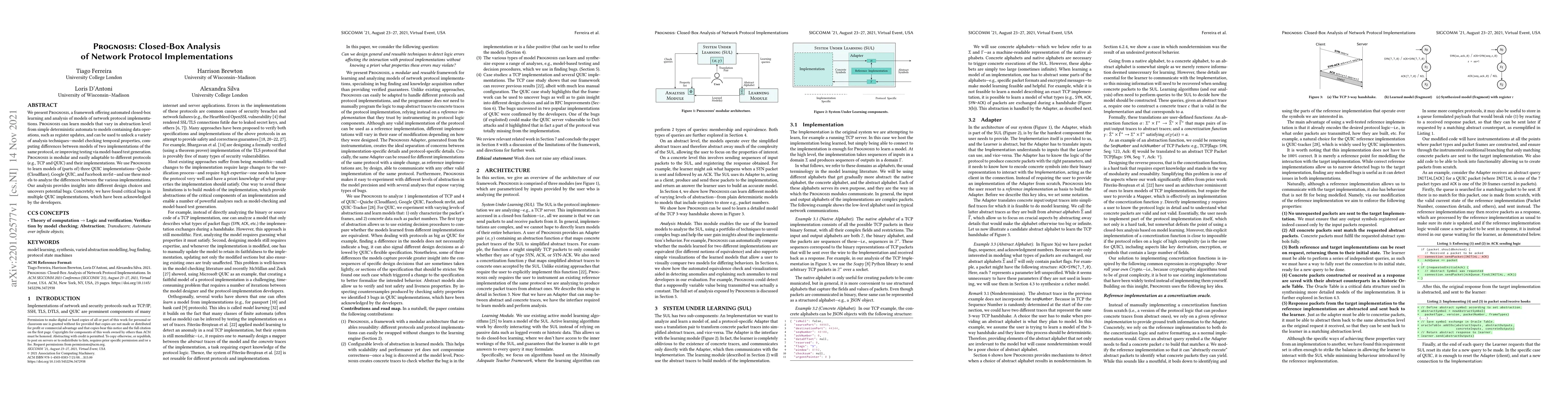 Prognosis is a framework for automated closed-box analysis of network protocol implementations, offering adaptable models for various abstraction levels and analysis techniques. It successfully identified critical bugs in several QUIC implementations, highlighting design differences and prompting developer acknowledgments.