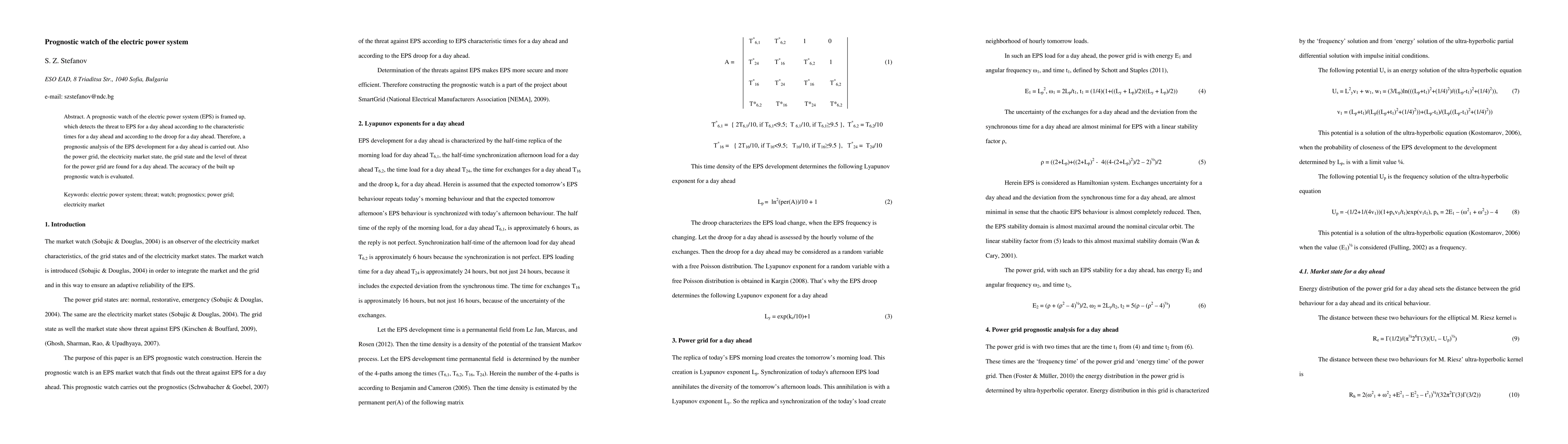 A prognostic watch of the electric power system (EPS)is framed up, which detects the threat to EPS for a day ahead according to the characteristic times for a day ahead and according to the droop for a day ahead. Therefore, a prognostic analysis of the EPS development for a day ahead is carried out. Also the power grid, the electricity marker state, the grid state and the level of threat for a power grid are found for a day ahead. The accuracy of the built up prognostic watch is evaluated.