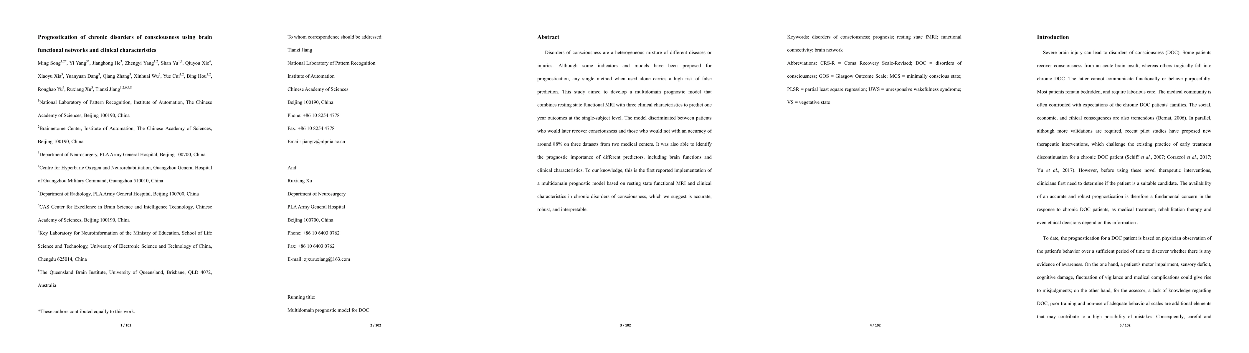 This study developed a multidomain prognostic model combining resting state functional MRI and clinical characteristics to predict one-year outcomes in chronic disorders of consciousness, achieving around 90% accuracy across multiple datasets. The model identified the prognostic importance of both brain functions and clinical factors, suggesting its accuracy, robustness, and interpretability.