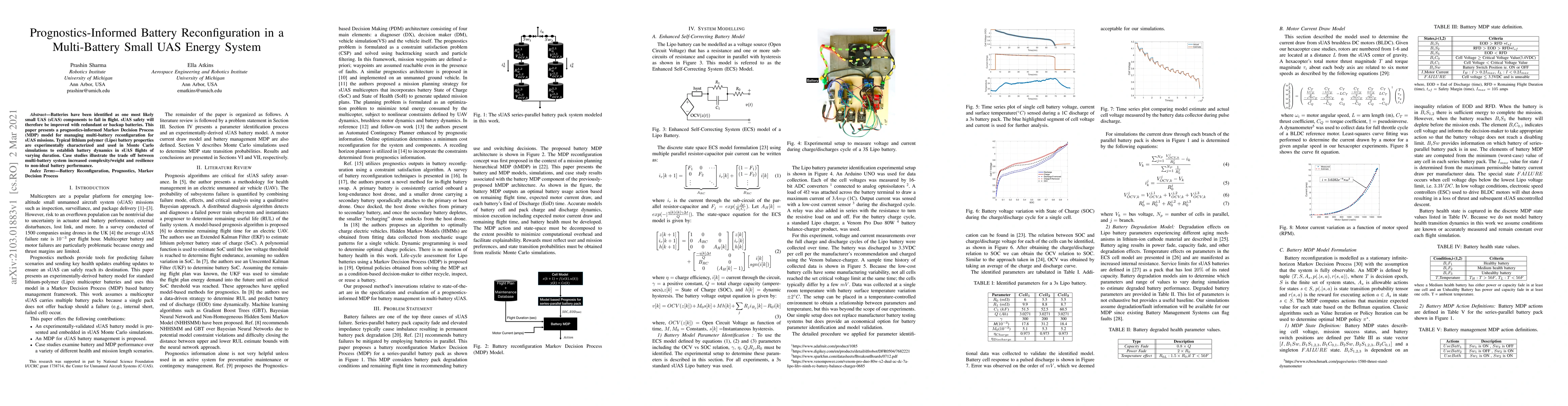 This paper develops a prognostics-informed Markov Decision Process model to manage multi-battery reconfiguration in small UAS systems, aiming to enhance safety by mitigating battery failure risks. Experimentally characterized lithium polymer battery properties are used in simulations to evaluate system resilience against varying flight durations and performance conditions.