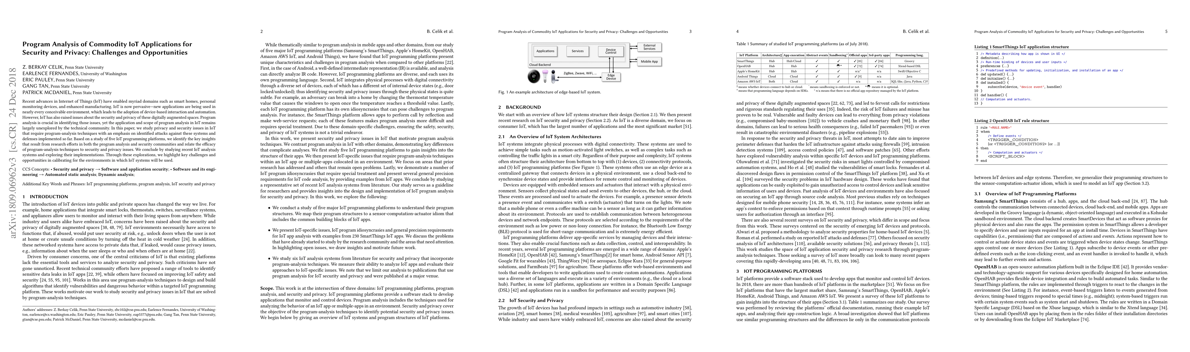 Recent advances in Internet of Things (IoT) have enabled myriad domains such as smart homes, personal monitoring devices, and enhanced manufacturing. IoT is now pervasive---new applications are being used in nearly every conceivable environment, which leads to the adoption of device-based interaction and automation. However, IoT has also raised issues about the security and privacy of these digitally augmented spaces. Program analysis is crucial in identifying those issues, yet the application and scope of program analysis in IoT remains largely unexplored by the technical community. In this paper, we study privacy and security issues in IoT that require program-analysis techniques with an emphasis on identified attacks against these systems and defenses implemented so far. Based on a study of five IoT programming platforms, we identify the key insights that result from research efforts in both the program analysis and security communities and relate the efficacy of program-analysis techniques to security and privacy issues. We conclude by studying recent IoT analysis systems and exploring their implementations. Through these explorations, we highlight key challenges and opportunities in calibrating for the environments in which IoT systems will be used.