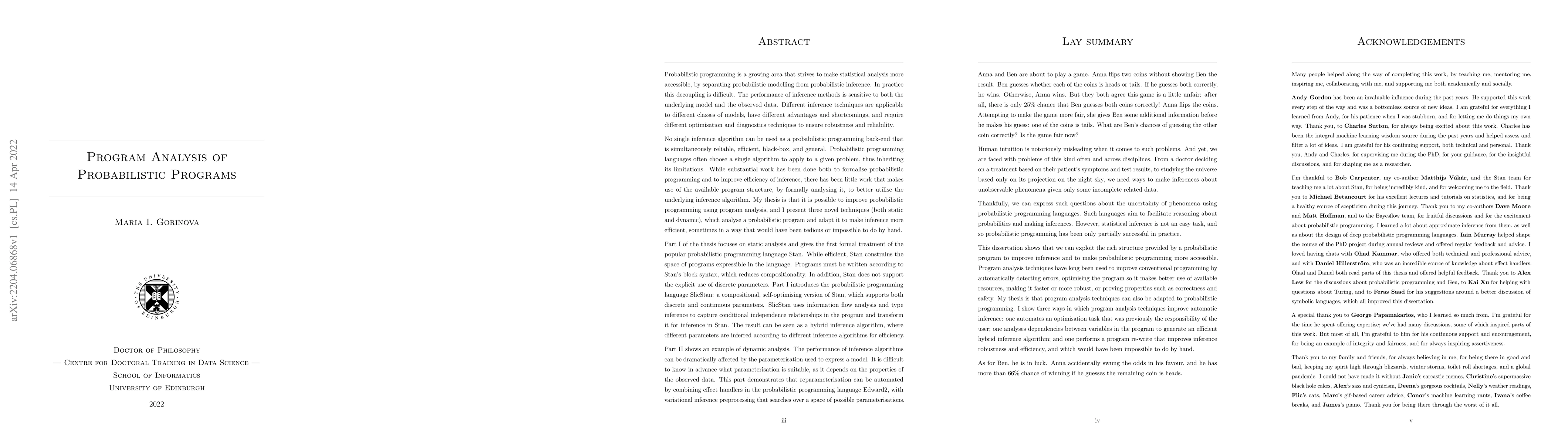 Probabilistic programming is a growing area that strives to make statistical analysis more accessible, by separating probabilistic modelling from probabilistic inference. In practice this decoupling is difficult. No single inference algorithm can be used as a probabilistic programming back-end that is simultaneously reliable, efficient, black-box, and general. Probabilistic programming languages often choose a single algorithm to apply to a given problem, thus inheriting its limitations. While substantial work has been done both to formalise probabilistic programming and to improve efficiency of inference, there has been little work that makes use of the available program structure, by formally analysing it, to better utilise the underlying inference algorithm. This dissertation presents three novel techniques (both static and dynamic), which aim to improve probabilistic programming using program analysis. The techniques analyse a probabilistic program and adapt it to make inference more efficient, sometimes in a way that would have been tedious or impossible to do by hand.
