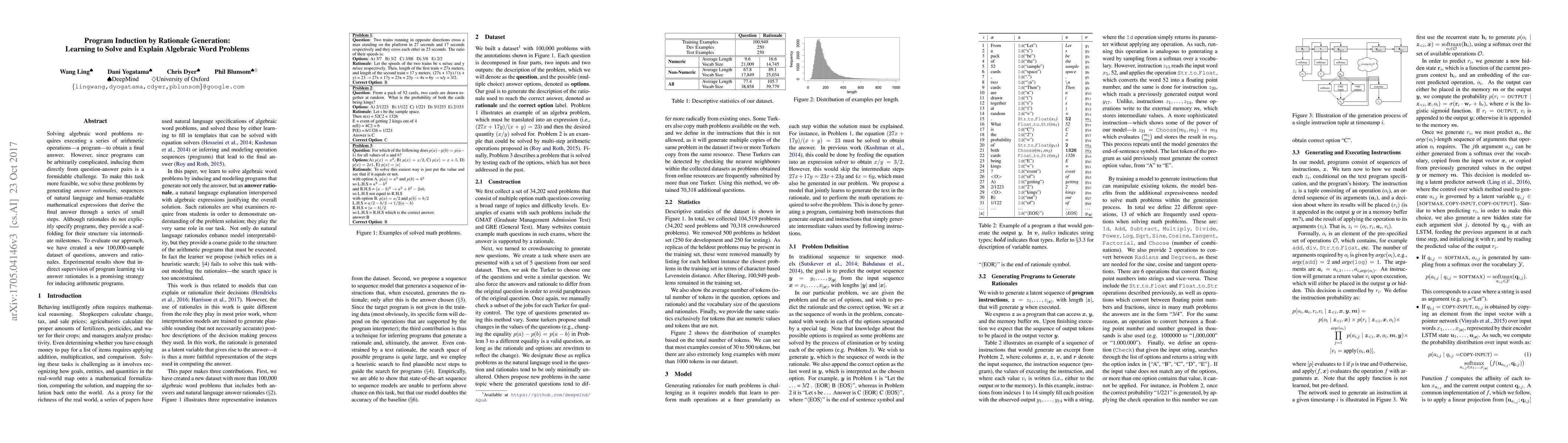 This paper proposes a method to solve algebraic word problems by generating rationales—sequences of natural language and mathematical expressions that outline the steps to the final answer. This approach provides a structured scaffold for inducing the underlying arithmetic programs, demonstrating a promising strategy for tackling the complexity of program induction.