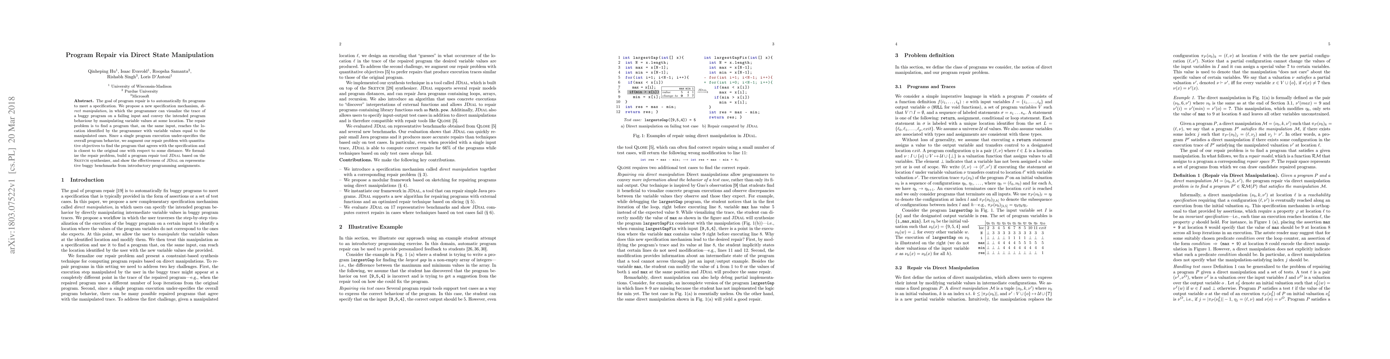 This paper introduces a novel specification mechanism called direct state manipulation for program repair, enabling programmers to fix bugs by visualizing program traces and adjusting variable values. The tool JDial, based on the Sketch synthesizer, employs quantitative objectives to generate repairs that are both specification-compliant and close to the original program.