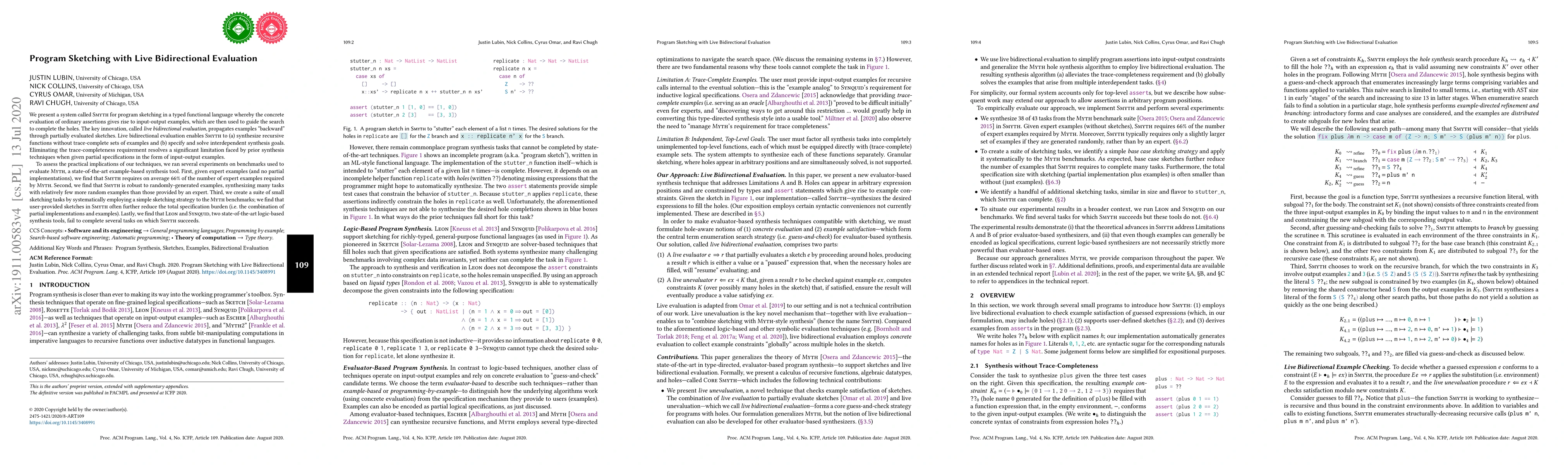 The paper introduces Smyth, a system for program sketching in functional languages using live bidirectional evaluation. This method allows Smyth to synthesize recursive functions with fewer examples and handle interdependent synthesis goals, overcoming limitations of prior techniques. Experiments show Smyth requires fewer examples than Myth, is robust to random examples, reduces specification burden with user sketches, and outperforms logic-based tools on certain tasks.