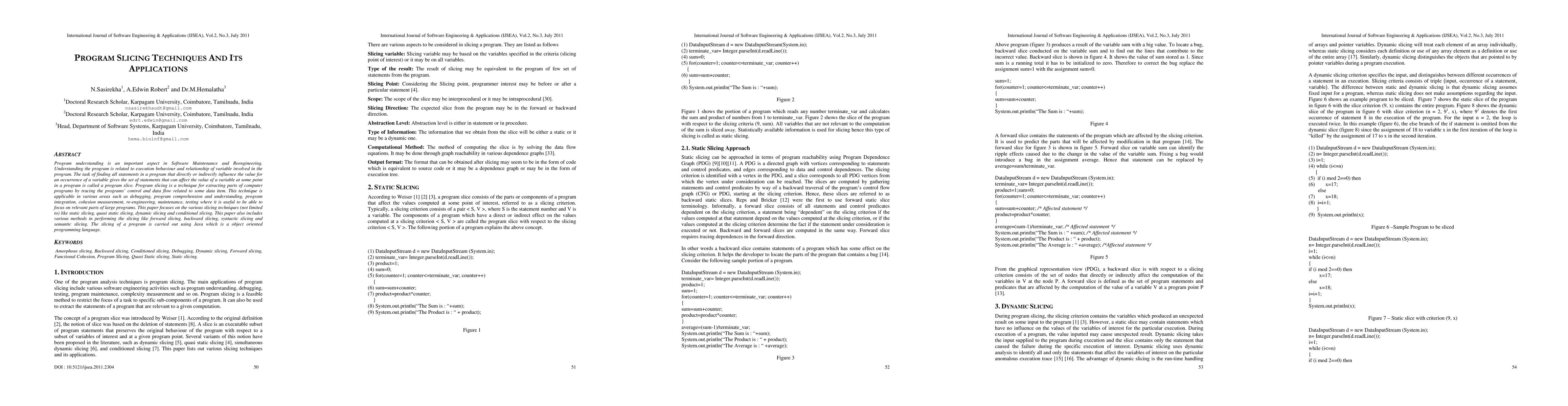 This paper explores various program slicing techniques, including static, quasi static, dynamic, and conditional slicing, and their applications in debugging, comprehension, maintenance, and integration. It also discusses methods like forward, backward, syntactic, and semantic slicing, implemented using Java.