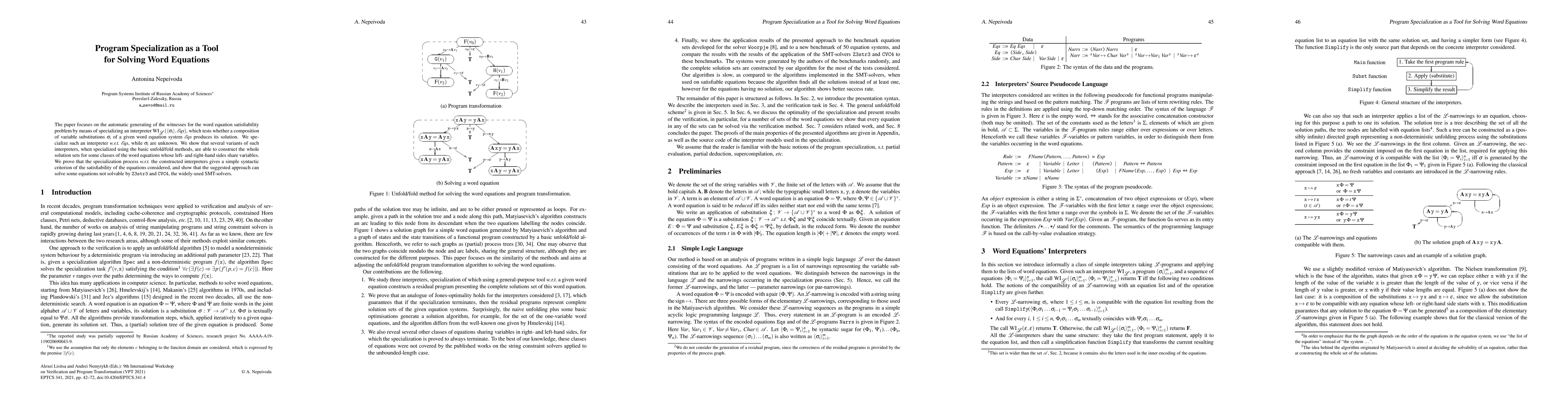 The paper focuses on the automatic generating of the witnesses for the word equation satisfiability problem by means of specializing an interpreter which tests whether a composition of variable substitutions of a given word equation system produces its solution. We specialize such an interpreter w.r.t. the equation system, while the substitutions are unknown. We show that several variants of such interpreters, when specialized using the basic unfold/fold specialization methods, are able to construct the whole solution sets for some classes of the word equations whose left- and right-hand sides share variables. We prove that the specialization process wrt the constructed interpreters gives a simple syntactic criterion of the satisfiability of the equations considered, and show that the suggested approach can solve some equations not solvable by Z3str3 and CVC4, the widely-used SMT-solvers.