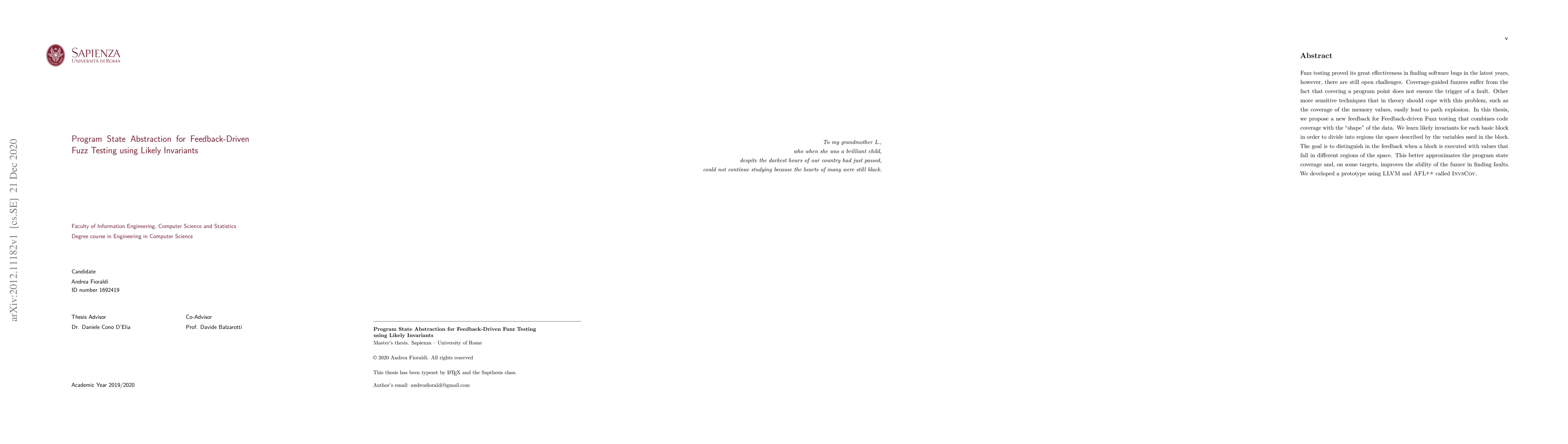 Fuzz testing proved its great effectiveness in finding software bugs in the latest years, however, there are still open challenges. Coverage-guided fuzzers suffer from the fact that covering a program point does not ensure the trigger of a fault. Other more sensitive techniques that in theory should cope with this problem, such as the coverage of the memory values, easily lead to path explosion. In this thesis, we propose a new feedback for Feedback-driven Fuzz testing that combines code coverage with the "shape" of the data. We learn likely invariants for each basic block in order to divide into regions the space described by the variables used in the block. The goal is to distinguish in the feedback when a block is executed with values that fall in different regions of the space. This better approximates the program state coverage and, on some targets, improves the ability of the fuzzer in finding faults. We developed a prototype using LLVM and AFL++ called InvsCov.