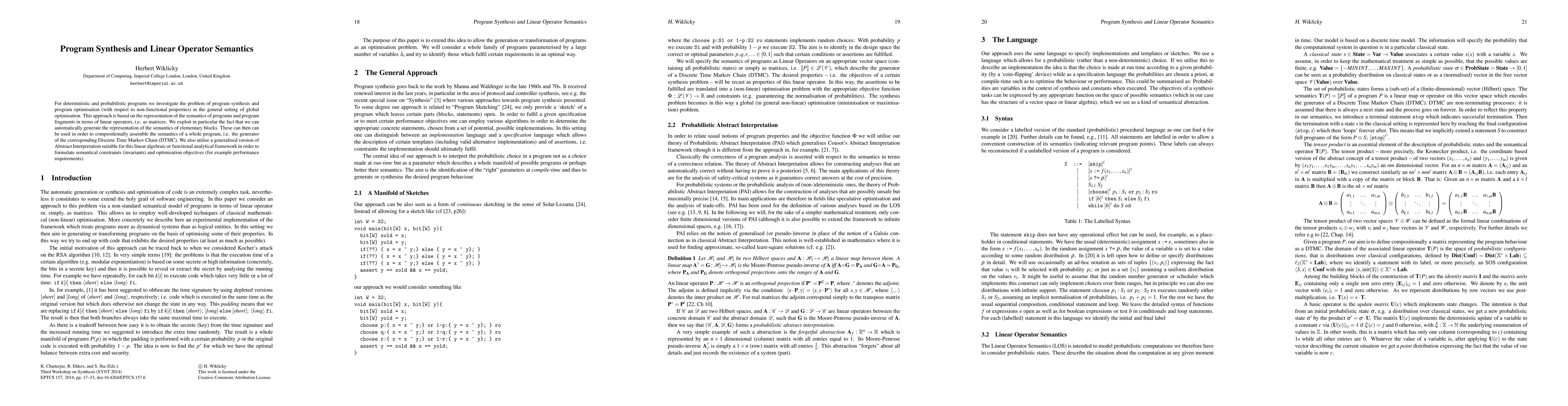 This paper explores program synthesis and optimization using linear operator semantics, representing program semantics as matrices. It employs compositional assembly of semantics through elementary blocks and applies abstract interpretation within a functional analytical framework to define constraints and optimization objectives.