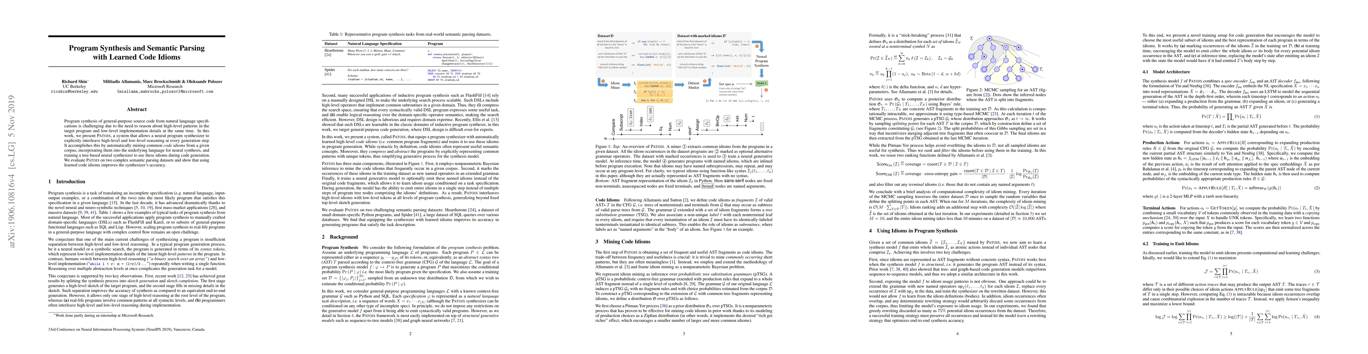 PATOIS is a system that enhances neural program synthesis by interleaving high-level and low-level reasoning through mined code idioms, improving accuracy on semantic parsing datasets. The system mines idioms from a corpus and trains a neural synthesizer to utilize these idioms during code generation.