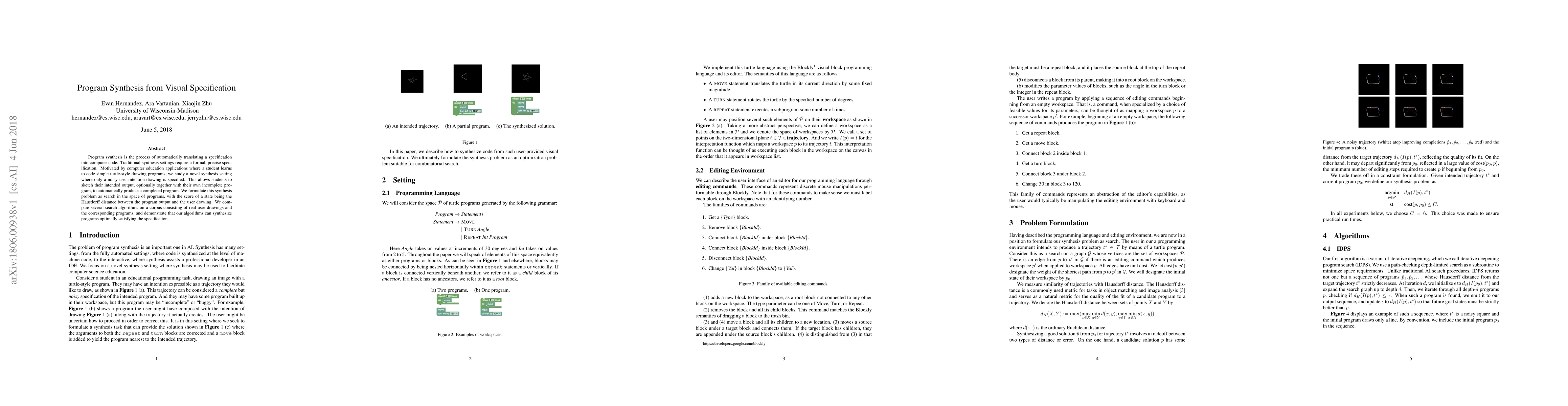 This paper explores program synthesis from visual specifications, specifically noisy user-intention drawings, to aid in computer education. It employs search algorithms to generate programs that match the user's sketches, optimizing based on the Hausdorff distance, and demonstrates successful synthesis through real user data.