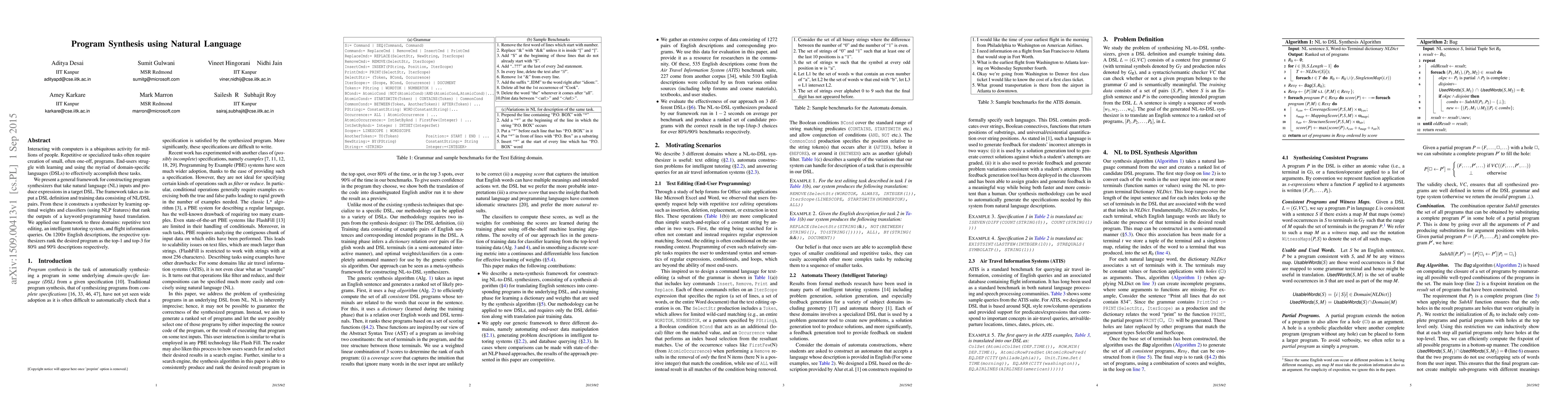 This paper introduces a framework for synthesizing programs from natural language inputs, aiming to simplify repetitive tasks by eliminating the need for users to learn domain-specific languages. The framework uses training data to construct synthesizers that translate natural language into DSL expressions, achieving high accuracy in three tested domains.