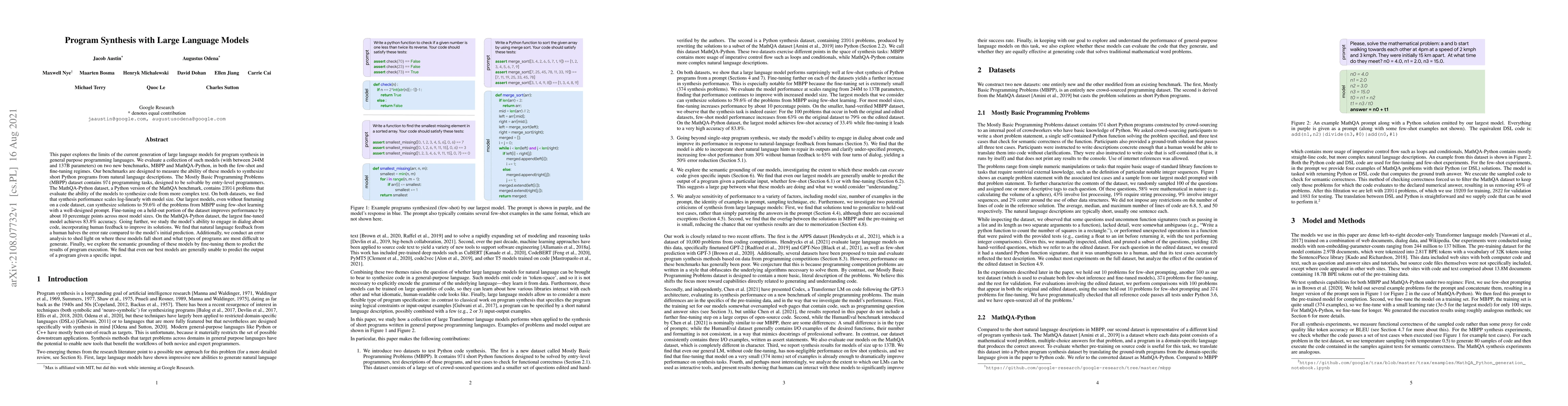 This paper evaluates large language models for program synthesis, finding that performance scales with model size, with the largest achieving 83.8% accuracy on complex tasks. Human feedback significantly improves model accuracy, but models struggle with semantic grounding and predicting program outputs.