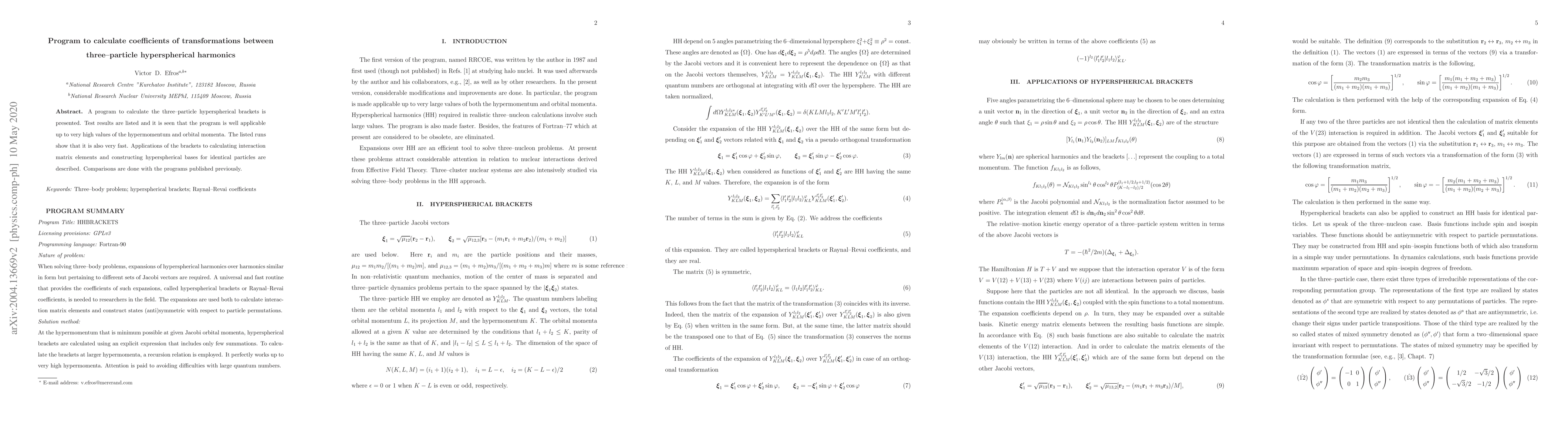 A program to calculate the three-particle hyperspherical brackets is presented. Test results are listed and it is seen that the program is well applicable up to very high values of the hypermomentum and orbital momenta. The listed runs show that it is also very fast. Applications of the brackets to calculating interaction matrix elements and constructing hyperspherical bases for identical particles are described. Comparisons are done with the programs published previously.