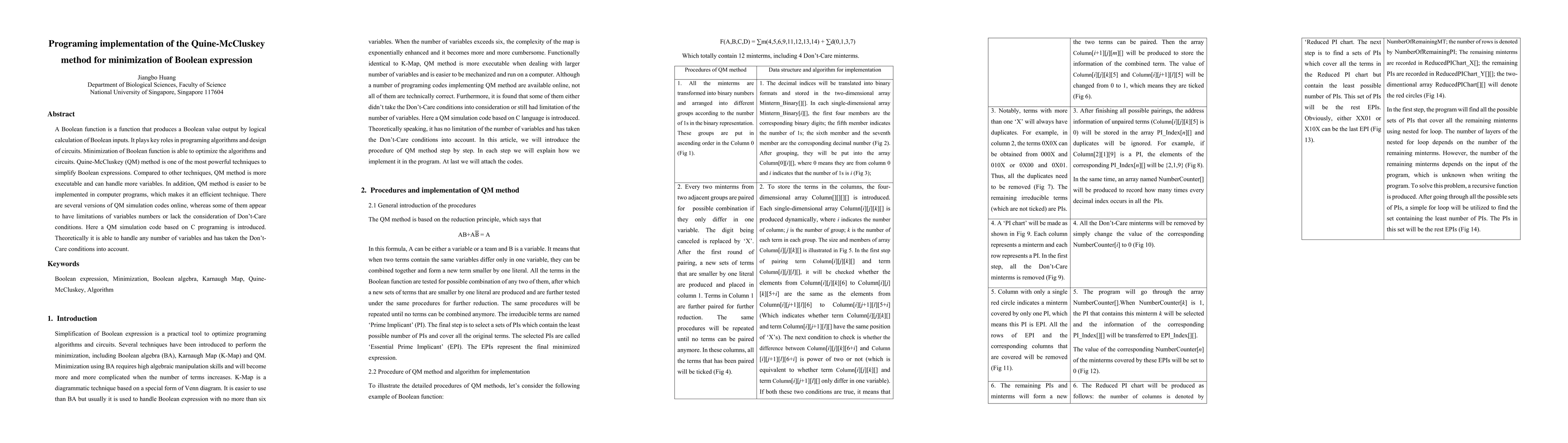 This paper presents a C programming implementation of the Quine-McCluskey method for minimizing Boolean expressions, capable of handling any number of variables and considering Don't-Care conditions, addressing limitations found in existing online simulation codes.
