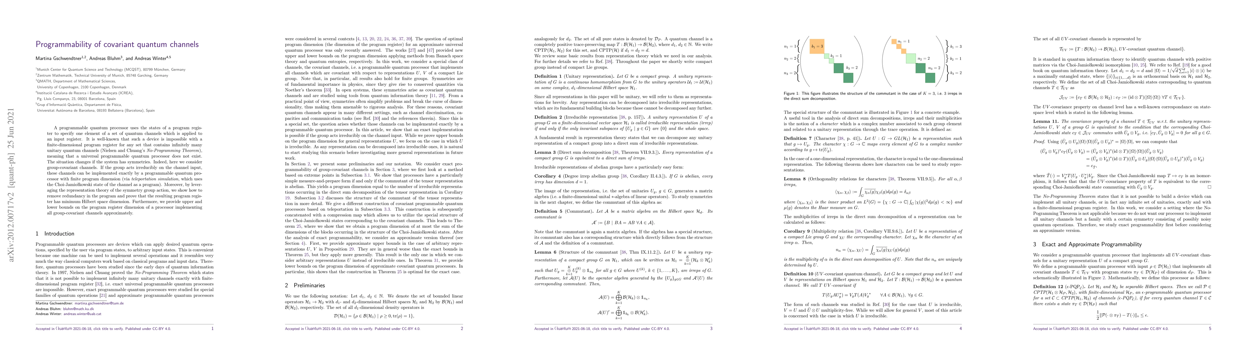This paper explores the programmability of quantum channels that are covariant under a symmetry group, demonstrating that with finite program dimension, such channels can be implemented using a programmable quantum processor through teleportation simulation. It also provides methods for minimizing program register dimensions and establishes bounds for approximate implementations.