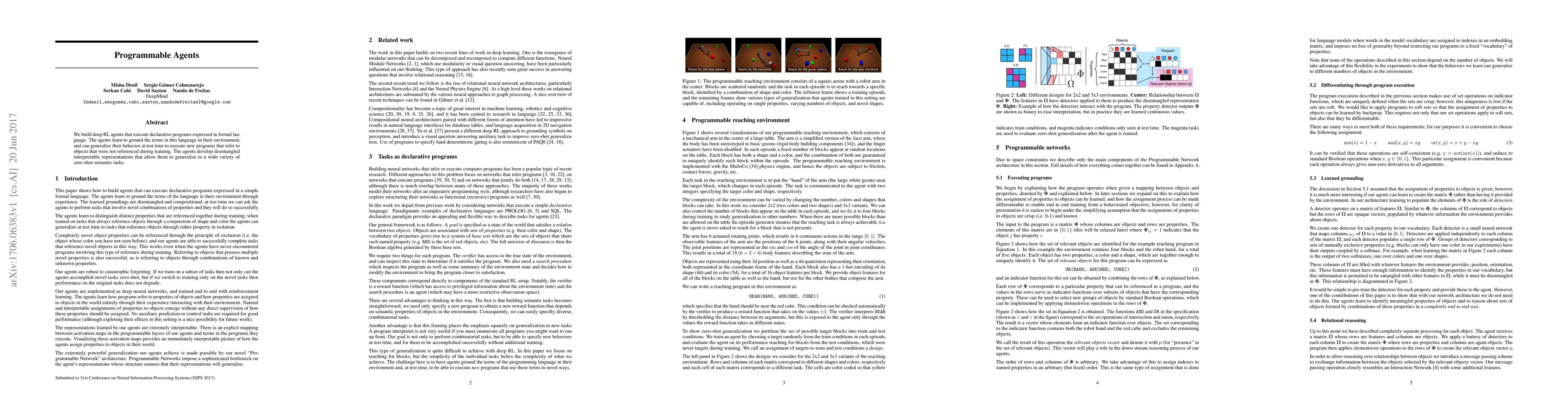 We build deep RL agents that execute declarative programs expressed in formal language. The agents learn to ground the terms in this language in their environment, and can generalize their behavior at test time to execute new programs that refer to objects that were not referenced during training. The agents develop disentangled interpretable representations that allow them to generalize to a wide variety of zero-shot semantic tasks.