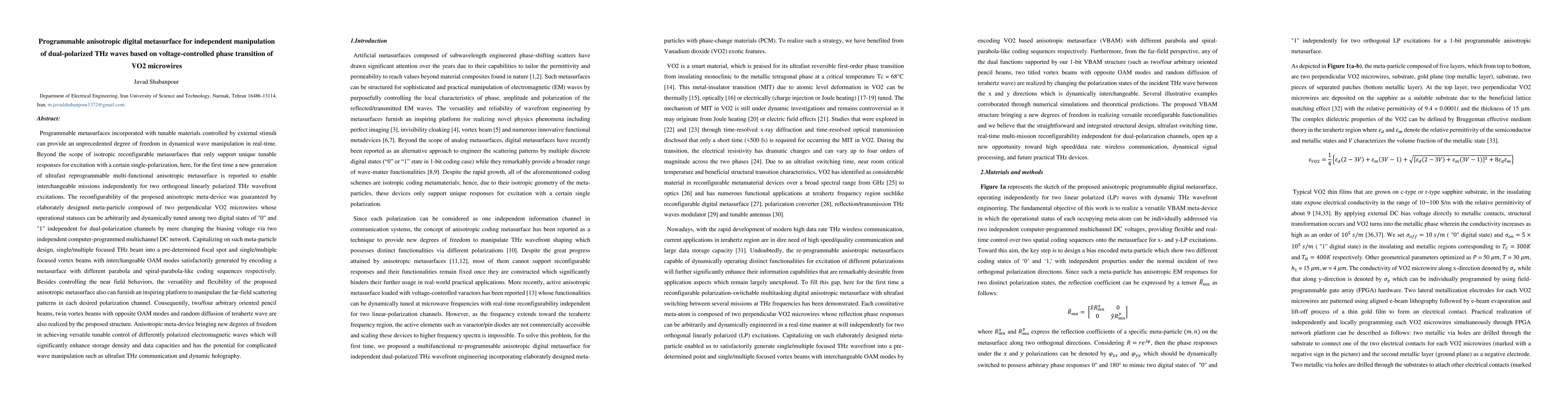 This paper presents a programmable anisotropic digital metasurface that independently manipulates dual-polarized THz waves using voltage-controlled VO2 microwires. The metasurface enables dynamic control over both polarization channels, facilitating versatile applications in THz communication and dynamic holography.
