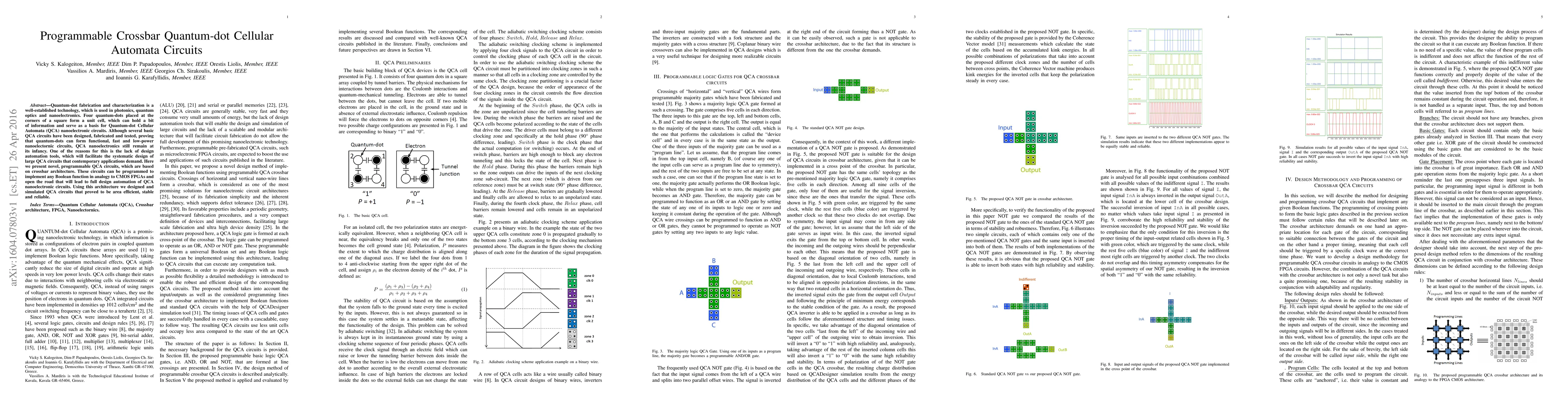 Quantum-dot fabrication and characterization is a well-established technology, which is used in photonics, quantum optics and nanoelectronics. Four quantum-dots placed at the corners of a square form a unit cell, which can hold a bit of information and serve as a basis for Quantum-dot Cellular Automata (QCA) nanoelectronic circuits. Although several basic QCA circuits have been designed, fabricated and tested, proving that quantum-dots can form functional, fast and low-power nanoelectornic circuits, QCA nanoelectronics still remain at its infancy. One of the reasons for this is the lack of design automation tools, which will facilitate the systematic design of large QCA circuits that contemporary applications demand. Here we present novel, programmable QCA circuits, which are based on crossbar architecture. These circuits can be programmed to implement any Boolean function in analogy to CMOS FPGAs and open the road that will lead to full design automation of QCA nanoelectronic circuits. Using this architecture we designed and simulated QCA circuits that proved to be area efficient, stable and reliable.