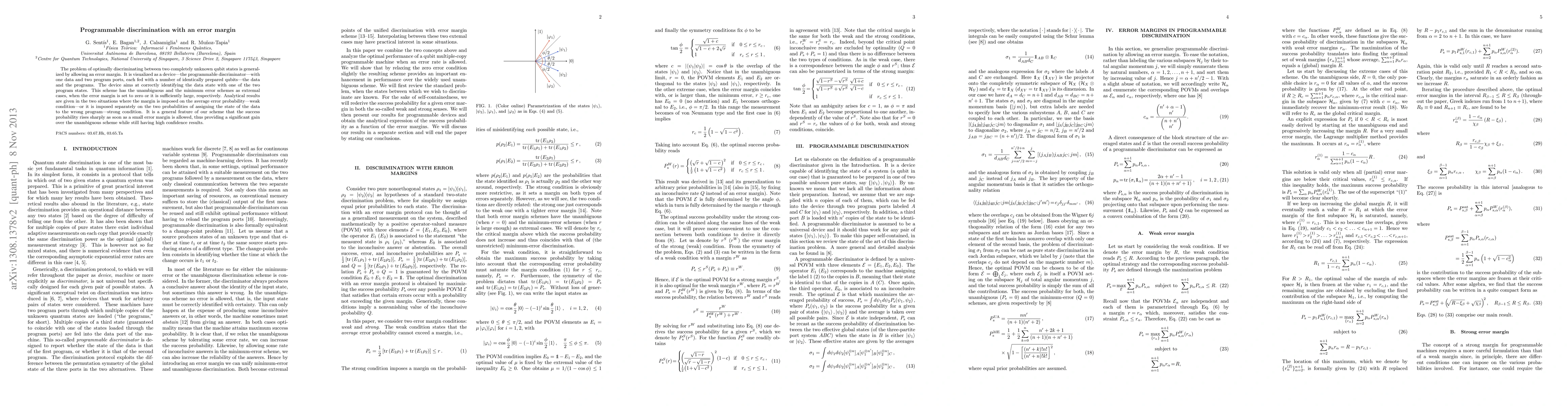 The problem of optimally discriminating between two completely unknown qubit states is generalized by allowing an error margin. It is visualized as a device---the programmable discriminator---with one data and two program ports, each fed with a number of identically prepared qubits---the data and the programs. The device aims at correctly identifying the data state with one of the two program states. This scheme has the unambiguous and the minimum-error schemes as extremal cases, when the error margin is set to zero or it is sufficiently large, respectively. Analytical results are given in the two situations where the margin is imposed on the average error probability---weak condition---or it is imposed separately on the two probabilities of assigning the state of the data to the wrong program---strong condition. It is a general feature of our scheme that the success probability rises sharply as soon as a small error margin is allowed, thus providing a significant gain over the unambiguous scheme while still having high confidence results.