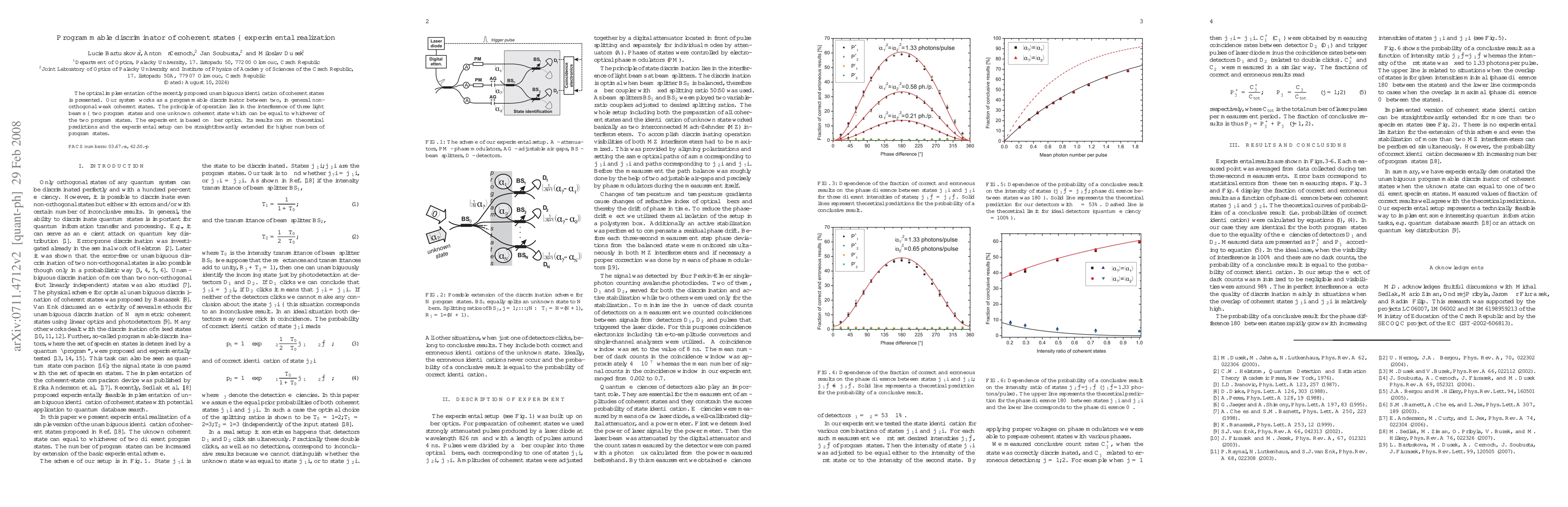 This paper presents an optical system for unambiguous identification of coherent states using fiber optics, functioning as a programmable discriminator between two weak coherent states. The setup relies on the interference of three light beams, confirming theoretical predictions and allowing for scalability to more program states.
