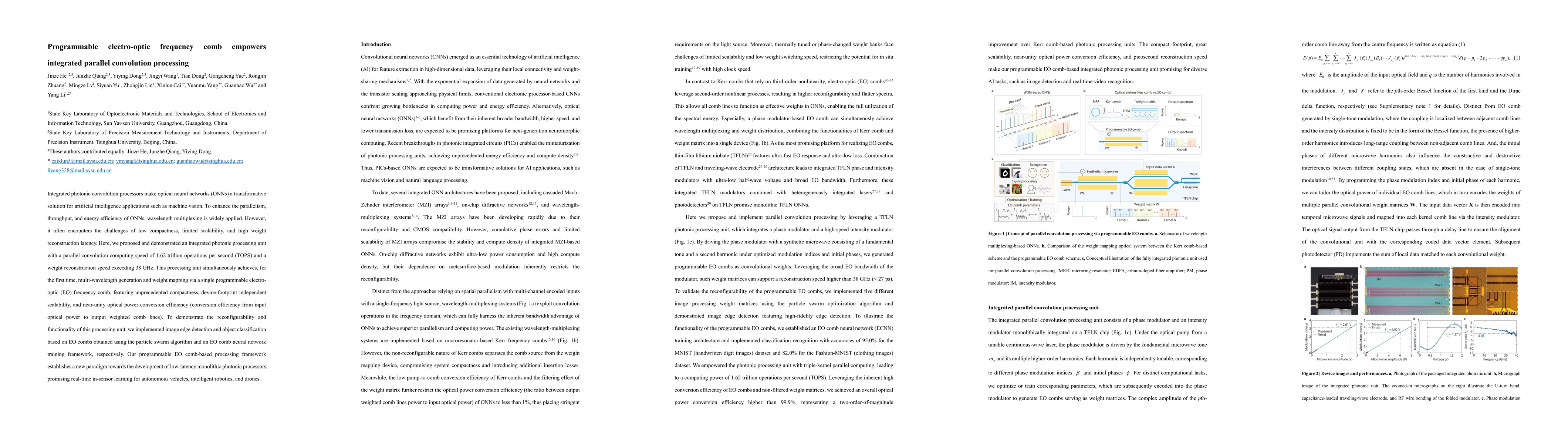 Integrated photonic convolution processors make optical neural networks (ONNs) a transformative solution for artificial intelligence applications such as machine vision. To enhance the parallelism, throughput, and energy efficiency of ONNs, wavelength multiplexing is widely applied. However, it often encounters the challenges of low compactness, limited scalability, and high weight reconstruction latency. Here, we proposed and demonstrated an integrated photonic processing unit with a parallel convolution computing speed of 1.62 trillion operations per second (TOPS) and a weight reconstruction speed exceeding 38 GHz. This processing unit simultaneously achieves, for the first time, multi-wavelength generation and weight mapping via a single programmable electro-optic (EO) frequency comb, featuring unprecedented compactness, device-footprint independent scalability, and near-unity optical power conversion efficiency (conversion efficiency from input optical power to output weighted comb lines). To demonstrate the reconfigurability and functionality of this processing unit, we implemented image edge detection and object classification based on EO combs obtained using the particle swarm algorithm and an EO comb neural network training framework, respectively. Our programmable EO comb-based processing framework establishes a new paradigm towards the development of low-latency monolithic photonic processors, promising real-time in-sensor learning for autonomous vehicles, intelligent robotics, and drones.