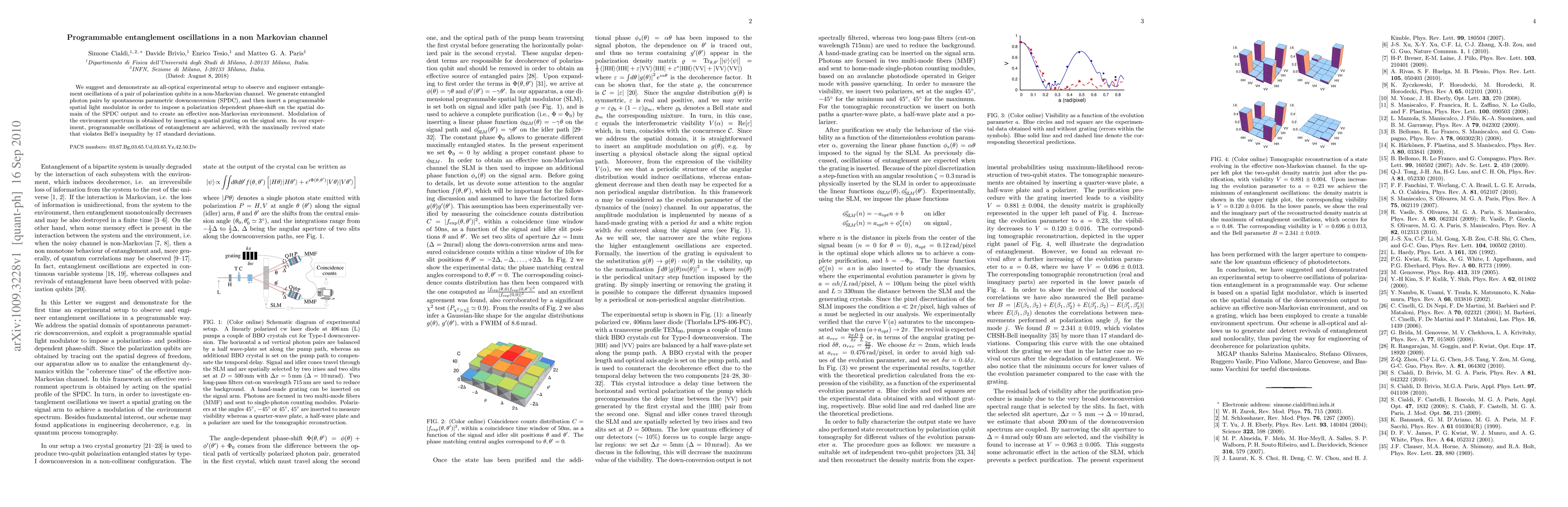 We suggest and demonstrate an all-optical experimental setup to observe and engineer entanglement oscillations of a pair of polarization qubits in a non-Markovian channel. We generate entangled photon pairs by spontaneous parametric downconversion (SPDC), and then insert a programmable spatial light modulator in order to impose a polarization dependent phase-shift on the spatial domain of the SPDC output and to create an effective non-Markovian environment. Modulation of the enviroment spectrum is obtained by inserting a spatial grating on the signal arm. In our experiment, programmable oscillations of entanglement are achieved, with the maximally revived state that violates Bell's inequality by 17 standard deviations.