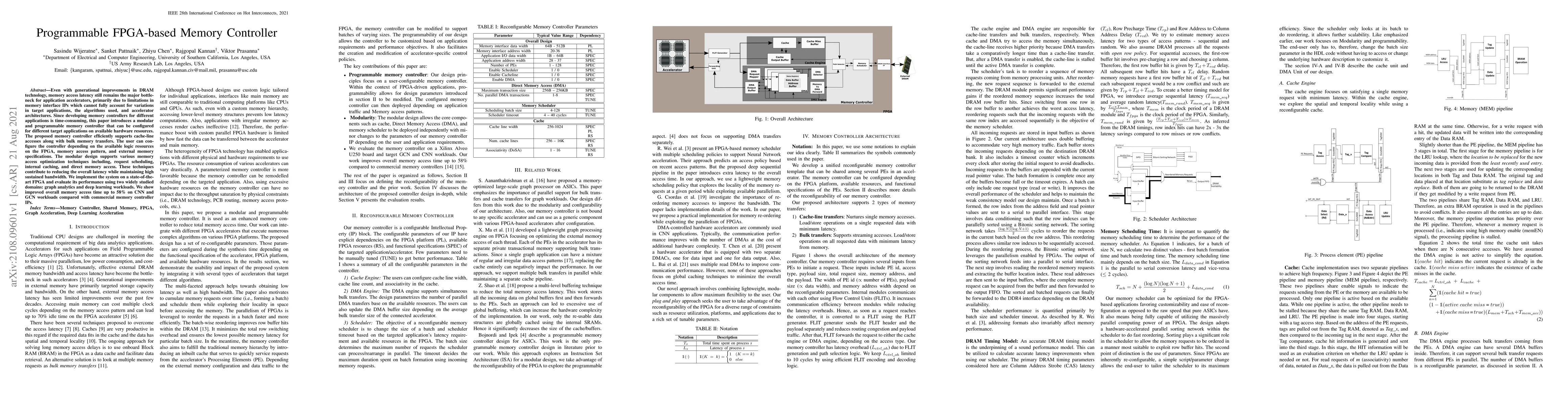 This paper introduces a programmable FPGA-based memory controller designed to optimize memory access latency for different applications, showing up to 58% improvement in memory access time for graph analytics and deep learning workloads compared to commercial IPs. The modular design supports various optimization techniques, including request scheduling and caching.