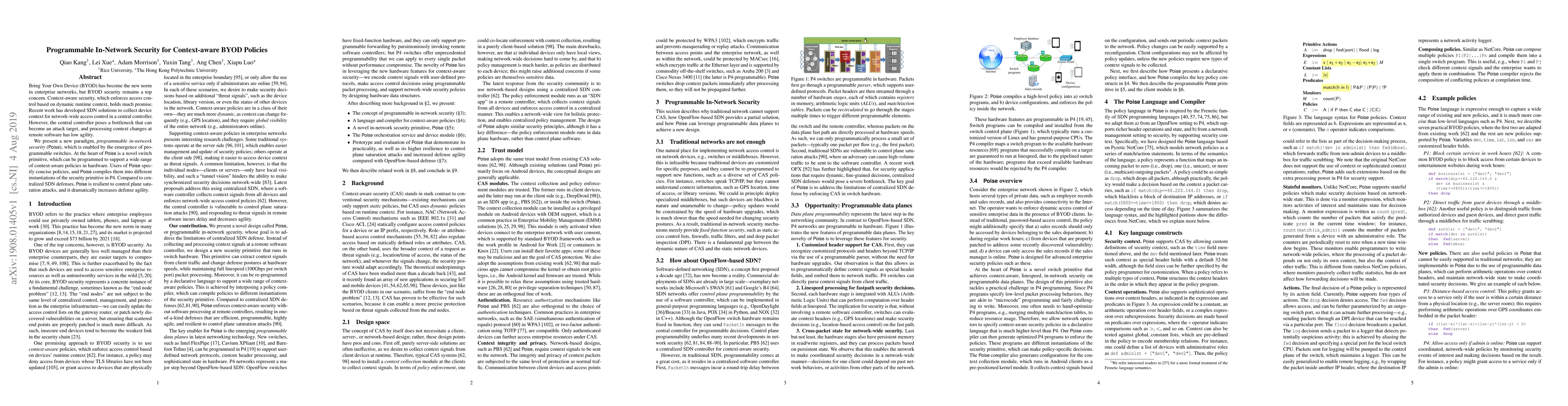 This paper introduces Poise, a programmable in-network security paradigm for BYOD environments, leveraging P4-programmable switches to enforce context-aware security policies directly in hardware. Poise enhances resilience against control plane attacks and significantly boosts defense agility compared to centralized SDN solutions.