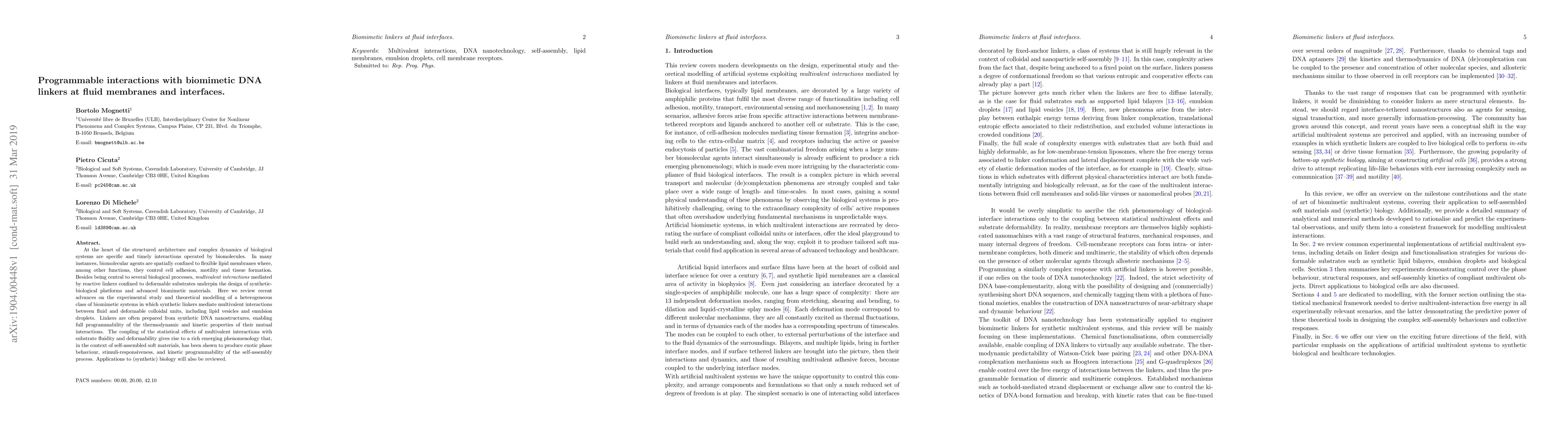 This paper reviews recent advances in biomimetic systems using programmable DNA linkers to mediate multivalent interactions at fluid membranes, highlighting the resulting complex phenomena such as phase behavior and stimuli-responsiveness, and discussing potential applications in synthetic biology.