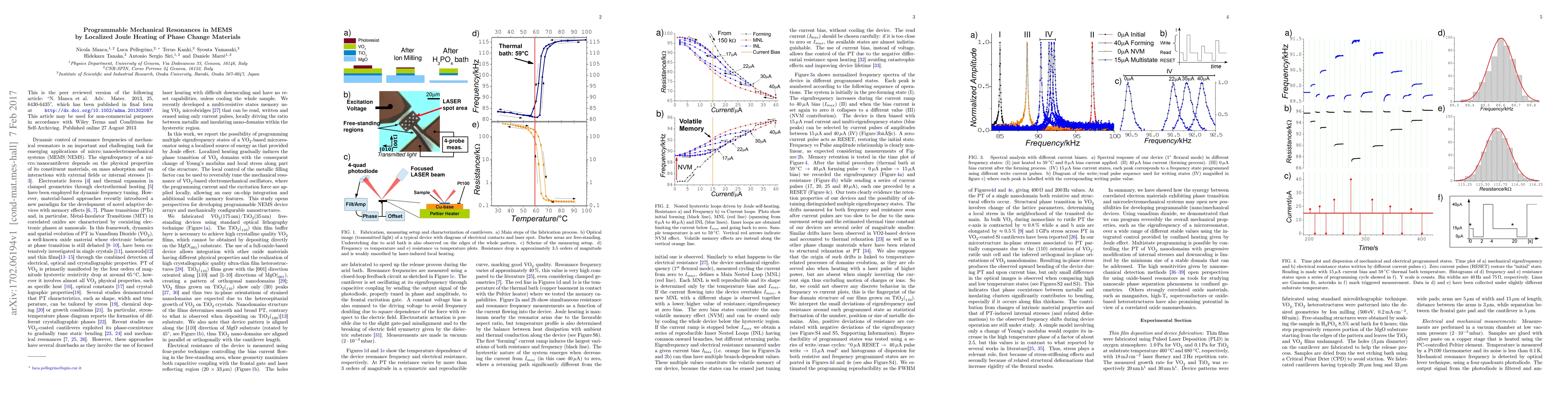A programmable MEMS resonator utilizing VO2 thin film is developed, employing Joule heating to control its mechanical eigenfrequencies. This method leverages VO2's phase transition near its Metal-Insulator transition temperature, enabling tunable stiffness through localized stress adjustments, paving the way for configurable nanostructure arrays.
