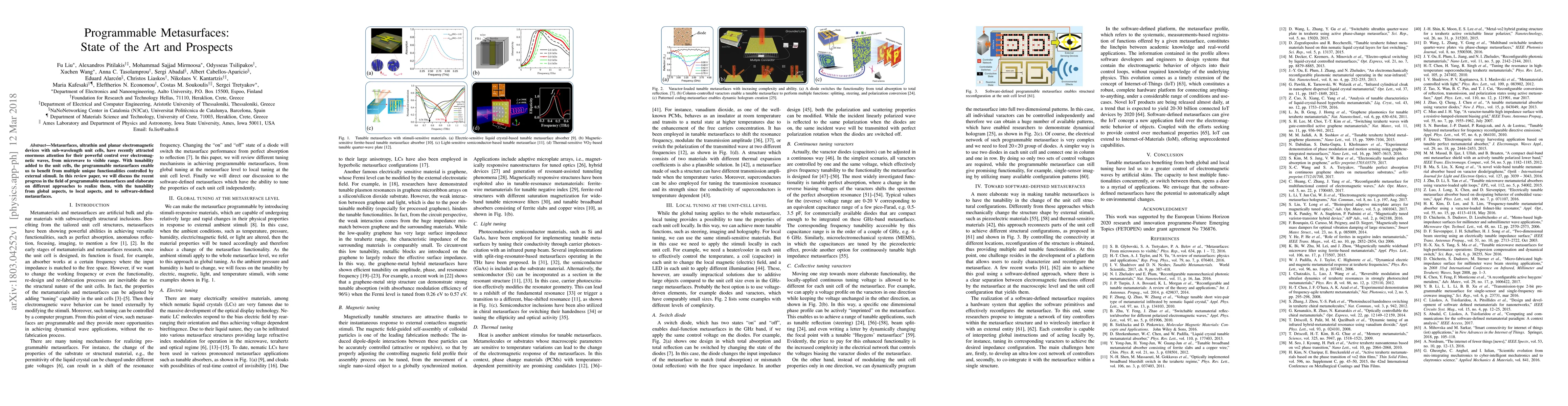 This paper reviews recent advancements in programmable metasurfaces, which are ultrathin electromagnetic devices capable of controlling waves across various frequencies. It explores different methods to achieve tunability, ranging from global to local and software-defined approaches, highlighting their potential functionalities.