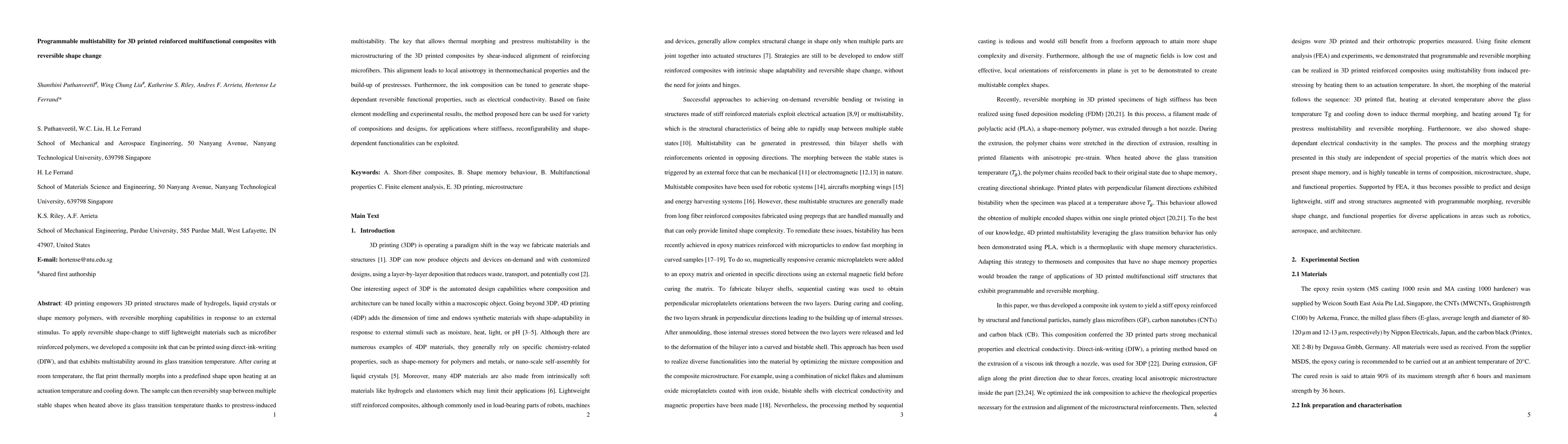 This paper presents a method for creating 3D printed reinforced composites that exhibit programmable multistability and reversible shape change through microstructuring and shear-induced alignment of microfibers. The developed composite ink allows for thermal morphing and prestress-induced multistability, enabling the material to snap between multiple stable shapes in response to temperature changes.