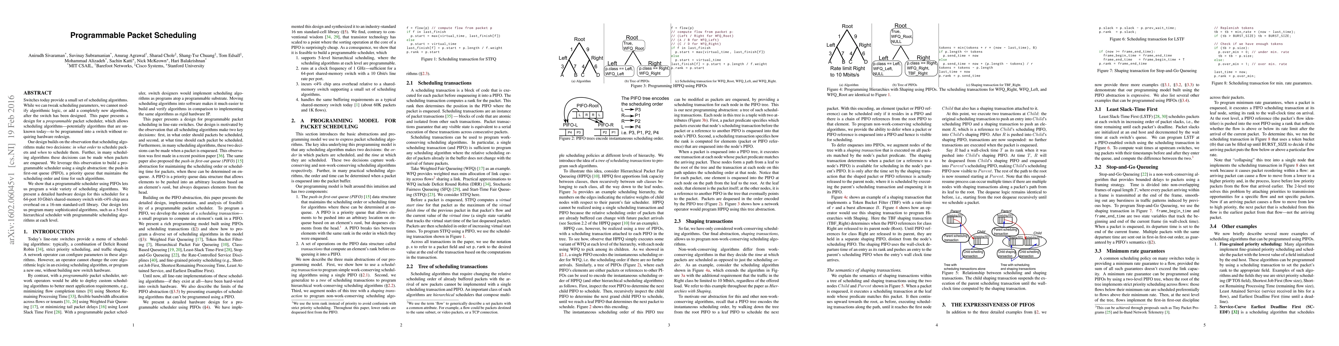 This paper introduces a programmable packet scheduler that enables the implementation of new scheduling algorithms without hardware redesign. The design uses a push-in first-out queue (PIFO) to maintain scheduling order and time, allowing for a wide variety of scheduling algorithms to be programmed into a switch.