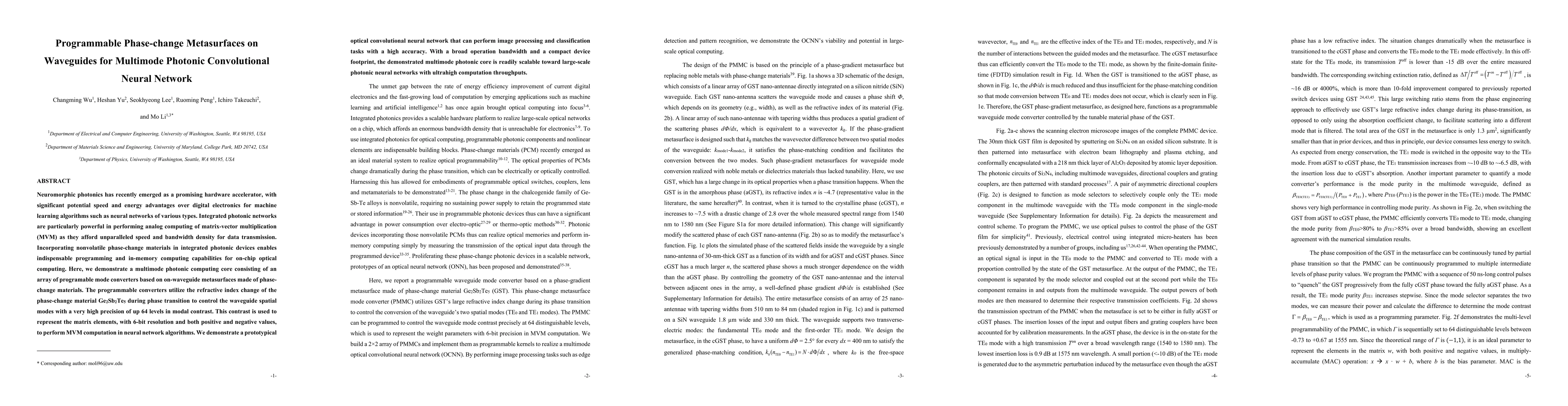 This paper presents a multimode photonic computing core using programmable phase-change metasurfaces on waveguides for efficient neural network computation, demonstrating high-precision modal contrast for matrix-vector multiplication and an optical convolutional neural network capable of image processing and classification. The device offers a compact and scalable solution for large-scale photonic processors.