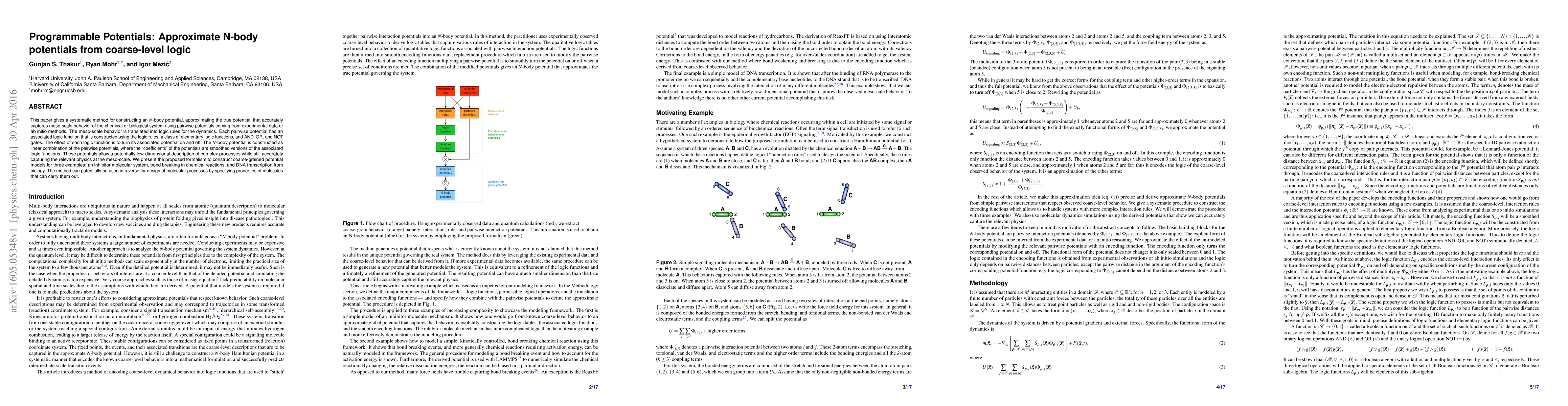 This paper gives a systematic method for constructing an N-body potential, approximating the true potential, that accurately captures meso-scale behavior of the chemical or biological system using pairwise potentials coming from experimental data or ab initio methods. The meso-scale behavior is translated into logic rules for the dynamics. Each pairwise potential has an associated logic function that is constructed using the logic rules, a class of elementary logic functions, and AND, OR, and NOT gates. The effect of each logic function is to turn its associated potential on and off. The N-body potential is constructed as linear combination of the pairwise potentials, where the "coefficients" of the potentials are smoothed versions of the associated logic functions. These potentials allow a potentially low-dimensional description of complex processes while still accurately capturing the relevant physics at the meso-scale. We present the proposed formalism to construct coarse-grained potential models for three examples: an inhibitor molecular system, bond breaking in chemical reactions, and DNA transcription from biology. The method can potentially be used in reverse for design of molecular processes by specifying properties of molecules that can carry them out.