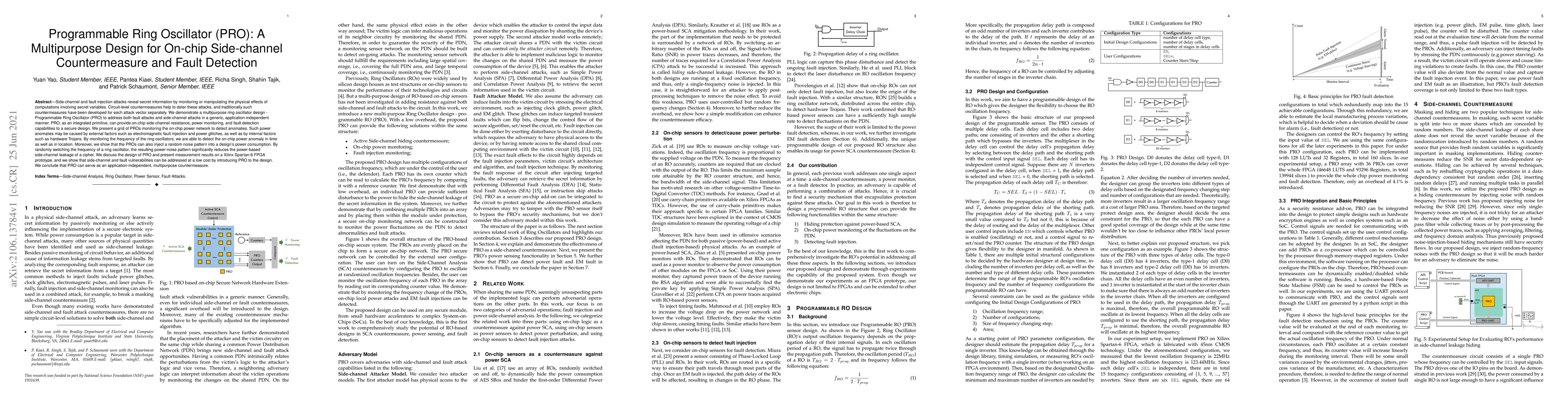 The Programmable Ring Oscillator (PRO) design is a versatile countermeasure against side-channel and fault injection attacks, offering on-chip side-channel resistance, power monitoring, and fault detection. PROs detect power anomalies and reduce power-based side-channel leakage by injecting random noise patterns, demonstrating effectiveness in a Xilinx Spartan-6 FPGA prototype.