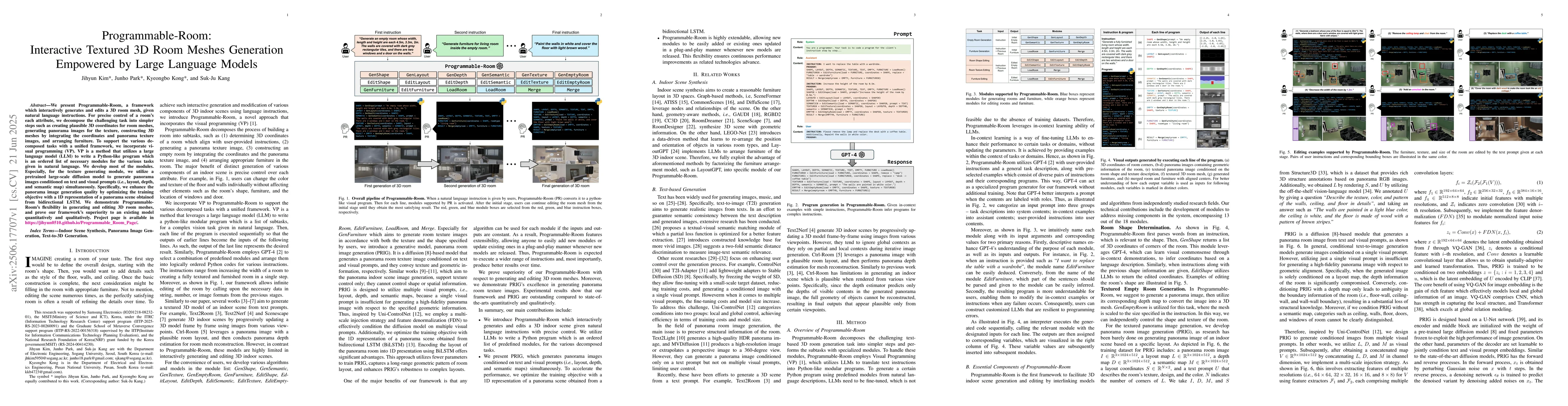 We present Programmable-Room, a framework which interactively generates and edits a 3D room mesh, given natural language instructions. For precise control of a room's each attribute, we decompose the challenging task into simpler steps such as creating plausible 3D coordinates for room meshes, generating panorama images for the texture, constructing 3D meshes by integrating the coordinates and panorama texture images, and arranging furniture. To support the various decomposed tasks with a unified framework, we incorporate visual programming (VP). VP is a method that utilizes a large language model (LLM) to write a Python-like program which is an ordered list of necessary modules for the various tasks given in natural language. We develop most of the modules. Especially, for the texture generating module, we utilize a pretrained large-scale diffusion model to generate panorama images conditioned on text and visual prompts (i.e., layout, depth, and semantic map) simultaneously. Specifically, we enhance the panorama image generation quality by optimizing the training objective with a 1D representation of a panorama scene obtained from bidirectional LSTM. We demonstrate Programmable-Room's flexibility in generating and editing 3D room meshes, and prove our framework's superiority to an existing model quantitatively and qualitatively. Project page is available in https://jihyun0510.github.io/Programmable_Room_Page/.