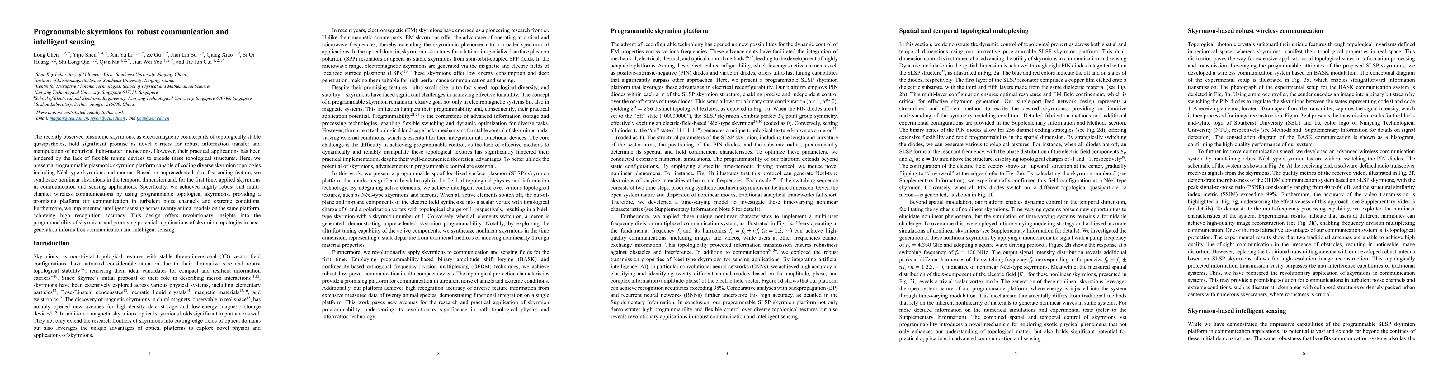 The recently observed plasmonic skyrmions, as electromagnetic counterparts of topologically stable quasiparticles, hold significant promise as novel carriers for robust information transfer and manipulation of nontrivial light-matter interactions. However, their practical applications has been hindered by the lack of flexible tuning devices to encode these topological structures. Here, we present a programmable plasmonic skyrmion platform capable of coding diverse skyrmion topologies, including N\'eel-type skyrmions and merons. Based on unprecedented ultra-fast coding feature, we synthesize nonlinear skyrmions in the temporal dimension and, for the first time, applied skyrmions in communication and sensing applications. Specifically, we achieved highly robust and multi-channel wireless communications by using programmable topological skyrmions, providing a promising platform for communication in turbulent noise channels and extreme conditions. Furthermore, we implemented intelligent sensing across twenty animal models on the same platform, achieving high recognition accuracy. This design offers revolutionary insights into the programmability of skyrmions and promising potentials applications of skyrmion topologies in next-generation information communication and intelligent sensing.