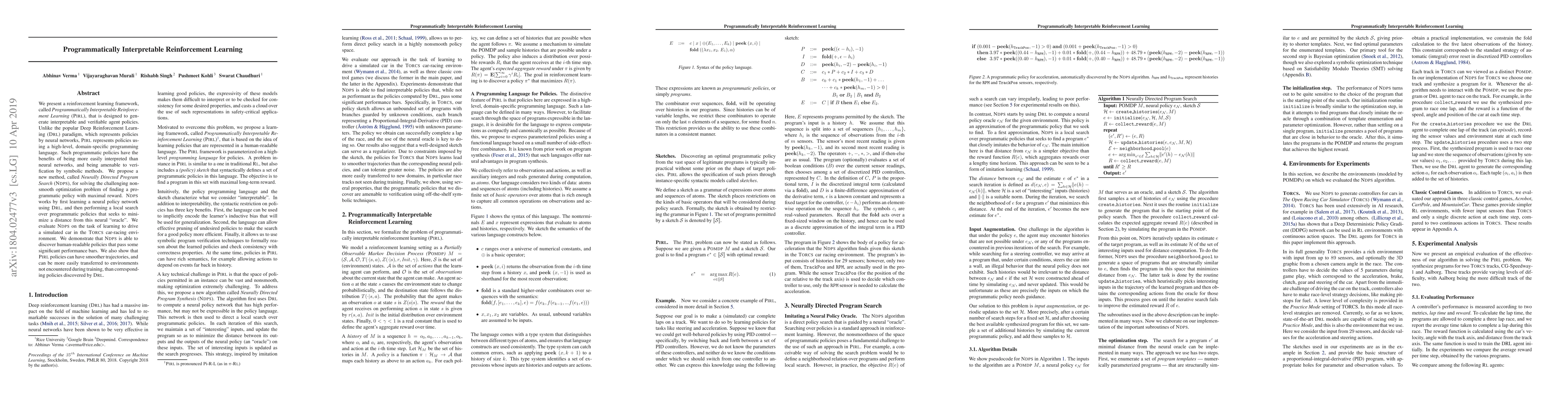This research introduces Programmatically Interpretable Reinforcement Learning (PIRL), which uses domain-specific programming languages for interpretable and verifiable agent policies, contrasting with neural networks in Deep Reinforcement Learning. The Neurally Directed Program Search (NDPS) method optimizes programmatic policies by combining a neural policy network with local search, demonstrating success in a simulated car-racing environment.