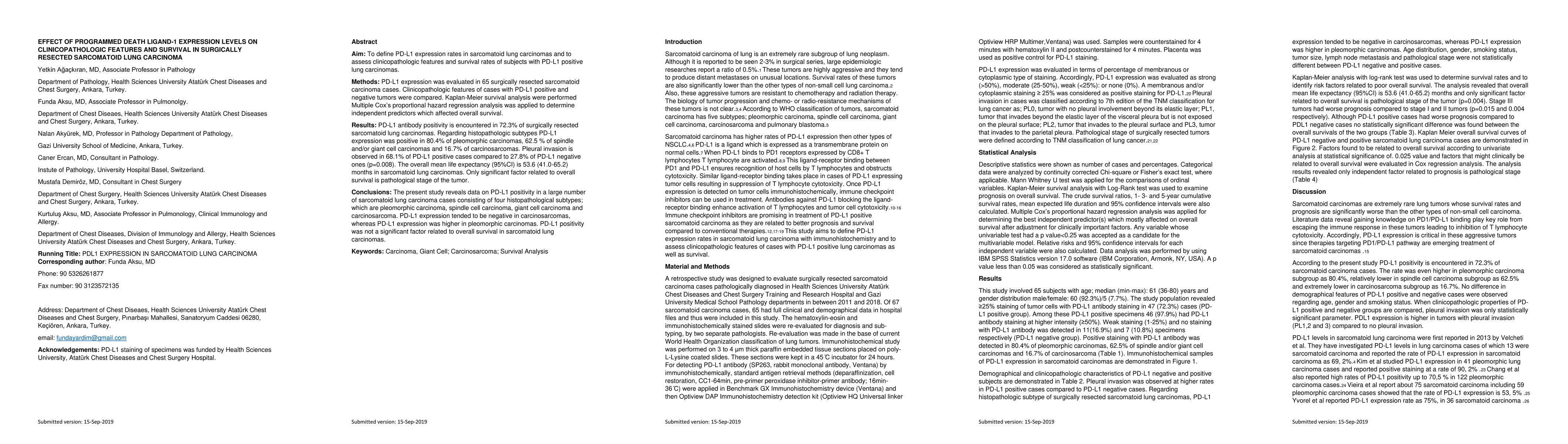 Aim: To determine the programmed death ligand-1 (PD-L1) expression rates in sarcomatoid lung carcinomas and to compare clinicopathologic features and survival rates of PD-L1-positive and negative patients. Methods: PD-L1 expression was evaluated in 65 surgically resected sarcomatoid carcinomas. The clinicopathologic features of cases with PD-L1-positive and negative tumors were compared. Kaplan-Meier survival analysis was performed. Multiple Cox proportional hazard regression analysis was performed to determine independent predictors of overall survival. Results: PD-L1 antibody positivity was found in 72.3% of surgically resected sarcomatoid lung carcinomas. Regarding histopathologic subtypes, PD-L1 expression was positive in 80.4% of pleomorphic carcinomas, 62.5% of spindle- and/or giant-cell carcinomas, and 16.7% of carcinosarcomas. Pleural invasion was observed in 68.1% of PD-L1-positive cases and 27.8% of PD-L1-negative cases (p = 0.008). No difference in survival was found between PD-L1-positive and negative tumors. The only factor significantly associated with poor survival was the pathological stage of the tumor. Conclusions: This study reveals a high rate of PD-L1 positivity in a large number of sarcomatoid lung carcinoma cases with pleomorphic carcinoma, spindle- and/or giantcell carcinoma, and carcinosarcoma subtypes. The only significantly different clinicopathologic feature in PD-L1-positive cases is pleural invasion. PD-L1 positivity is not a significant predictor of survival in sarcomatoid lung carcinomas.