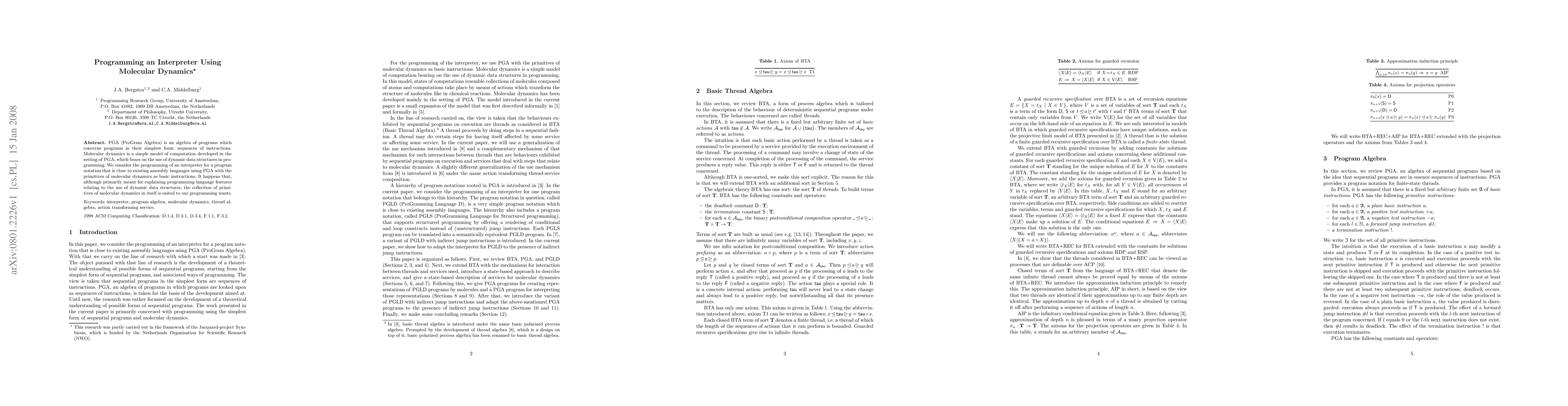 PGA (ProGram Algebra) is an algebra of programs which concerns programs in their simplest form: sequences of instructions. Molecular dynamics is a simple model of computation developed in the setting of PGA, which bears on the use of dynamic data structures in programming. We consider the programming of an interpreter for a program notation that is close to existing assembly languages using PGA with the primitives of molecular dynamics as basic instructions. It happens that, although primarily meant for explaining programming language features relating to the use of dynamic data structures, the collection of primitives of molecular dynamics in itself is suited to our programming wants.