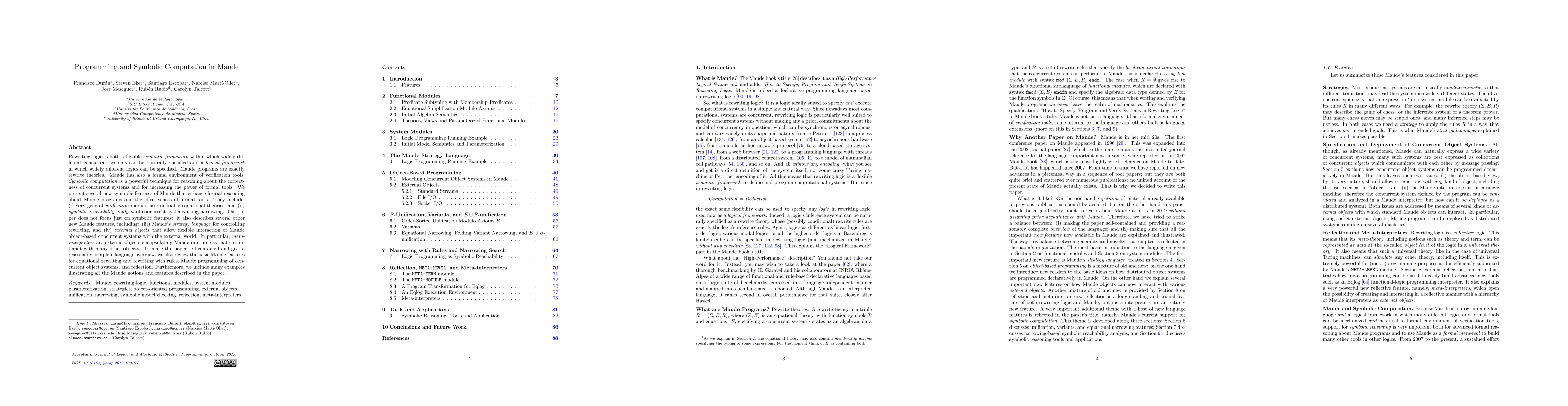 Rewriting logic is both a flexible semantic framework within which widely different concurrent systems can be naturally specified and a logical framework in which widely different logics can be specified. Maude programs are exactly rewrite theories. Maude has also a formal environment of verification tools. Symbolic computation is a powerful technique for reasoning about the correctness of concurrent systems and for increasing the power of formal tools. We present several new symbolic features of Maude that enhance formal reasoning about Maude programs and the effectiveness of formal tools. They include: (i) very general unification modulo user-definable equational theories, and (ii) symbolic reachability analysis of concurrent systems using narrowing. The paper does not focus just on symbolic features: it also describes several other new Maude features, including: (iii) Maude's strategy language for controlling rewriting, and (iv) external objects that allow flexible interaction of Maude object-based concurrent systems with the external world. In particular, meta-interpreters are external objects encapsulating Maude interpreters that can interact with many other objects. To make the paper self-contained and give a reasonably complete language overview, we also review the basic Maude features for equational rewriting and rewriting with rules, Maude programming of concurrent object systems, and reflection. Furthermore, we include many examples illustrating all the Maude notions and features described in the paper.