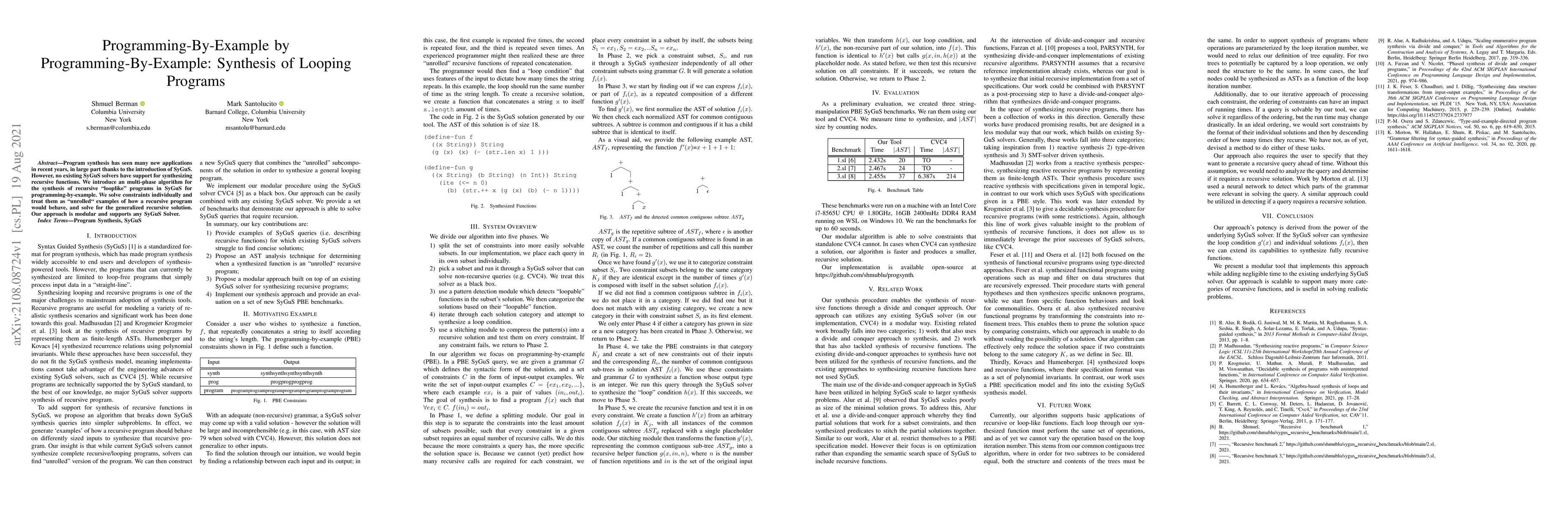 Program synthesis has seen many new applications in recent years, in large part thanks to the introduction of SyGuS. However, no existing SyGuS solvers have support for synthesizing recursive functions. We introduce an multi-phase algorithm for the synthesis of recursive ``looplike'' programs in SyGuS for programming-by-example. We solve constraints individually and treat them as ``unrolled`` examples of how a recursive program would behave, and solve for the generalized recursive solution. Our approach is modular and supports any SyGuS Solver.