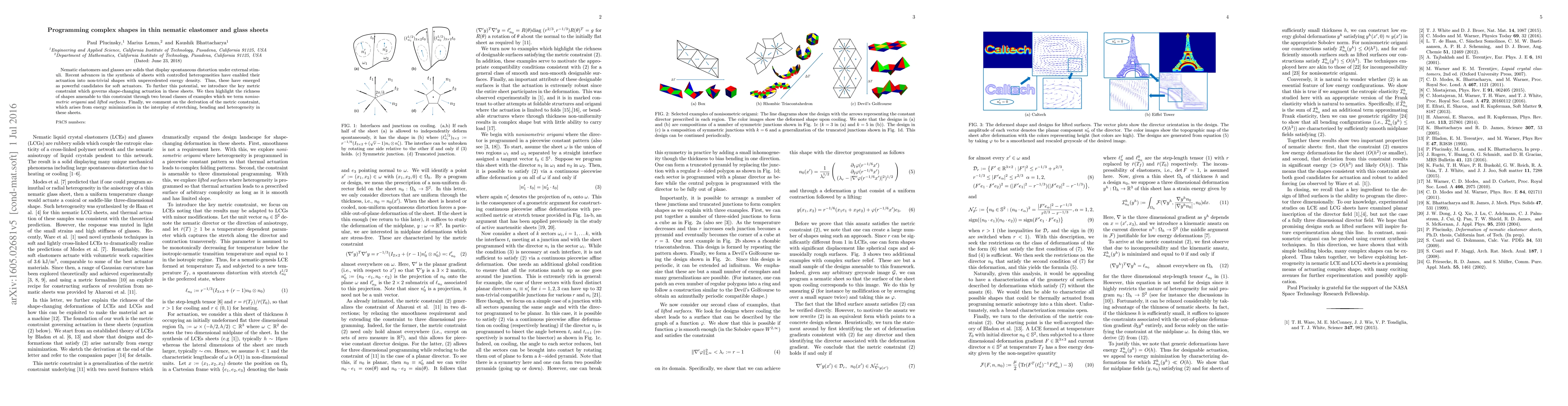 The research introduces a key metric constraint governing shape-changing actuation in thin nematic elastomer and glass sheets, highlighting the richness of shapes amenable to this constraint through nonisometric origami and lifted surfaces. The derivation of the metric constraint arises from energy minimization in the interplay of stretching, bending, and heterogeneity in these sheets.