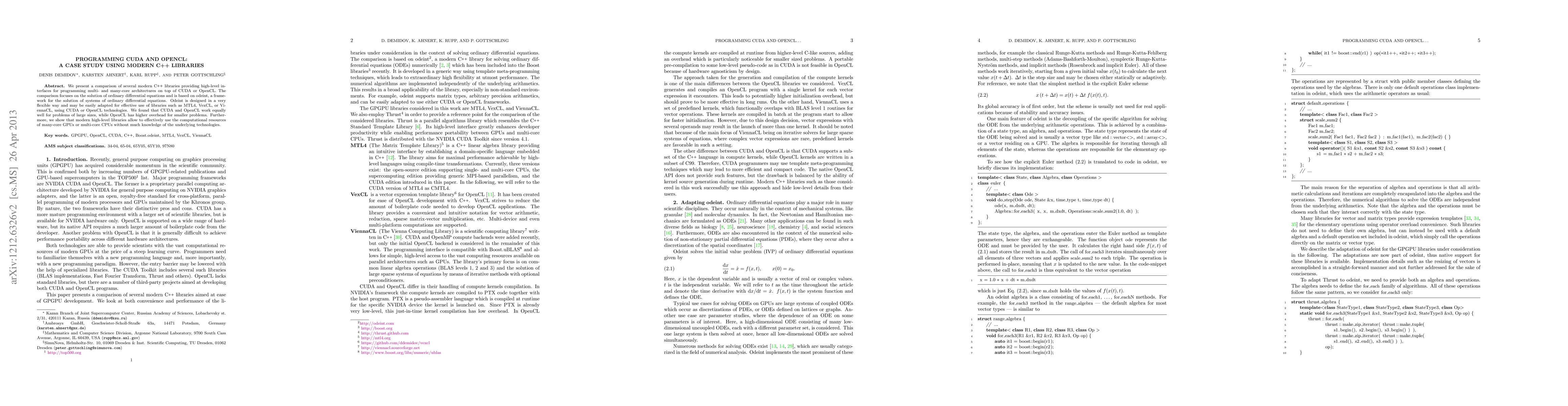 This paper compares modern C++ libraries for programming CUDA and OpenCL, focusing on solving ordinary differential equations with odeint. It finds that CUDA and OpenCL perform similarly for large problems, but OpenCL incurs higher overhead for smaller problems, while modern libraries simplify the use of GPU resources.