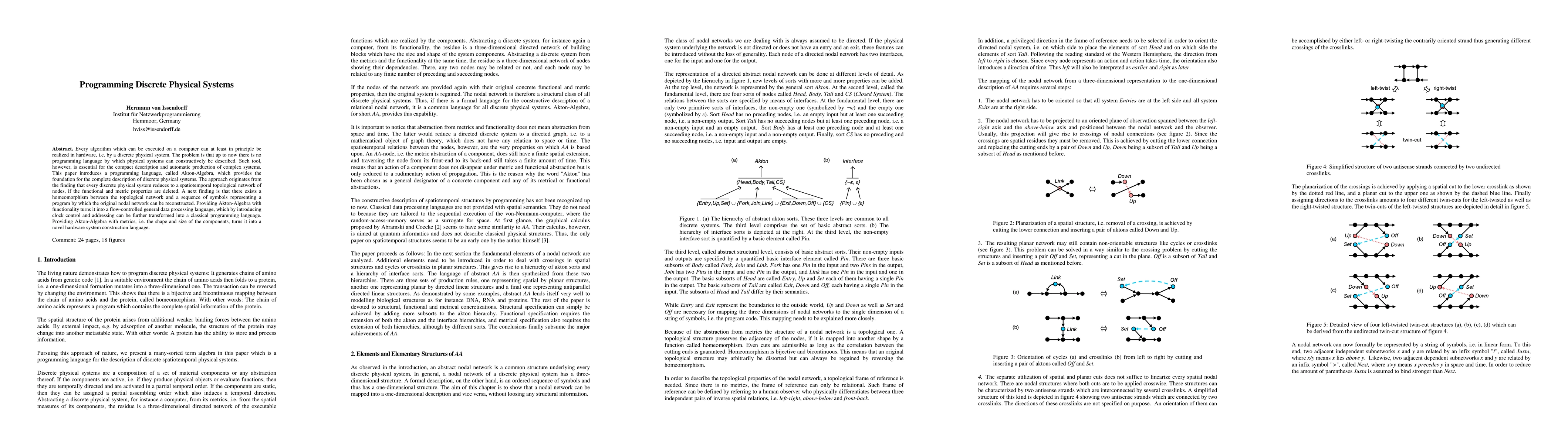 Every algorithm which can be executed on a computer can at least in principle be realized in hardware, i.e. by a discrete physical system. The problem is that up to now there is no programming language by which physical systems can constructively be described. Such tool, however, is essential for the compact description and automatic production of complex systems. This paper introduces a programming language, called Akton-Algebra, which provides the foundation for the complete description of discrete physical systems. The approach originates from the finding that every discrete physical system reduces to a spatiotemporal topological network of nodes, if the functional and metric properties are deleted. A next finding is that there exists a homeomorphism between the topological network and a sequence of symbols representing a program by which the original nodal network can be reconstructed. Providing Akton-Algebra with functionality turns it into a flow-controlled general data processing language, which by introducing clock control and addressing can be further transformed into a classical programming language. Providing Akton-Algebra with metrics, i.e. the shape and size of the components, turns it into a novel hardware system construction language.