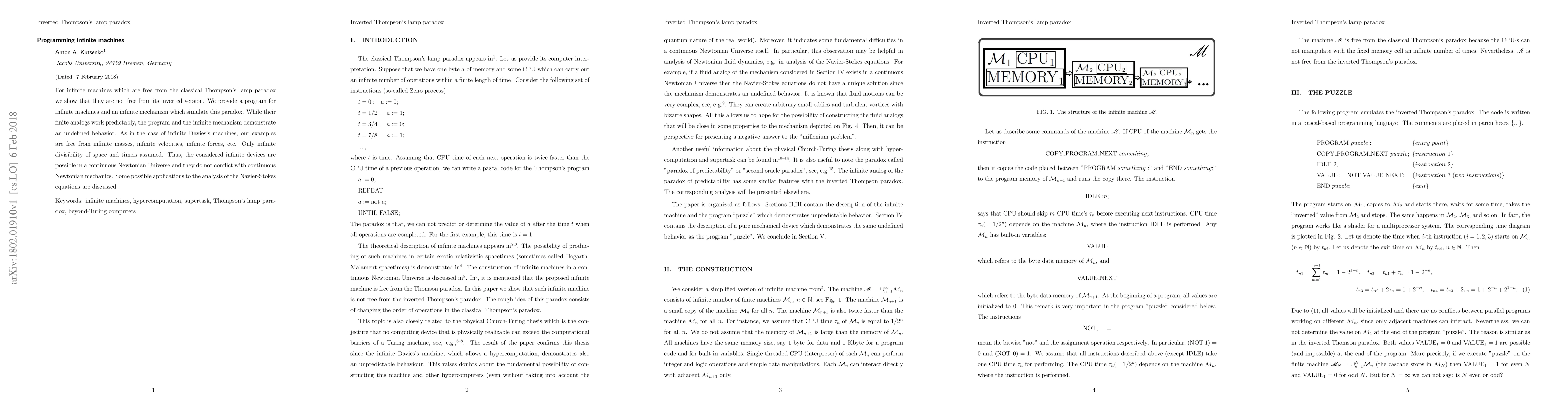 For infinite machines which are free from the classical Thompson's lamp paradox we show that they are not free from its inverted version. We provide a program for infinite machines and an infinite mechanism which simulate this paradox. While their finite analogs work predictably, the program and the infinite mechanism demonstrate an undefined behavior. As in the case of infinite Davies's machines, our examples are free from infinite masses, infinite velocities, infinite forces, etc. Only infinite divisibility of space and timeis assumed. Thus, the considered infinite devices are possible in a continuous Newtonian Universe and they do not conflict with continuous Newtonian mechanics. Some possible applications to the analysis of the Navier-Stokes equations are discussed.